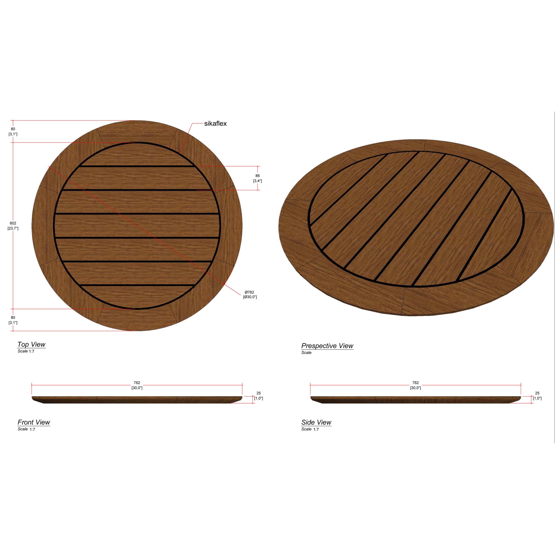 The 30" Dia x 1" Vogue Round Cafe Table Top defines contemporary outdoor dining. The tabletop is caulked with Sikaflex, a high-grade polyurethane sealant that prevents liquids from seeping through while providing a nautical appeal. This particular table top has a Reverse Bevel Teak Table Edge which fades in at the bottom to give a more contemporary bold style that surely gives a statement. This wood table top fits Gar Bases perfectly. Part of the Vogue Collection.