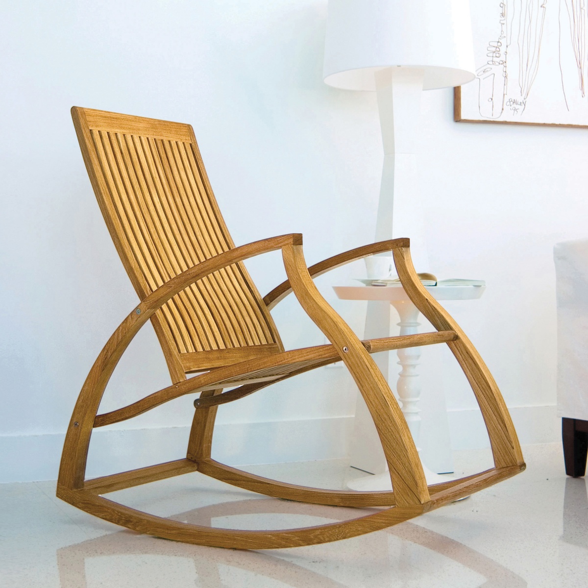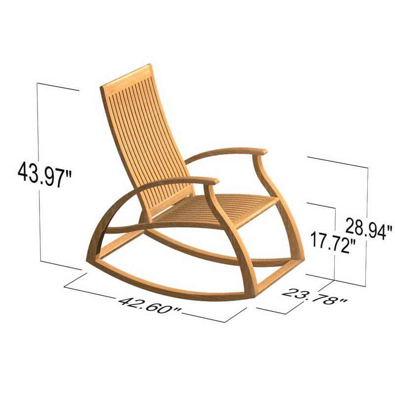 Defined by its sensuous curves and sweeping fluid lines, the Aria Teak Rocker is bound to be the conversational piece in any room or space. The Aria rocking chair is ergonomically designed with a contoured backrest and seat to maximize hours of comfortable seating, even without cushions. The extended rocking-arc and slightly tilted stance of the chair provides a pleasurable and gentle rocking motion.