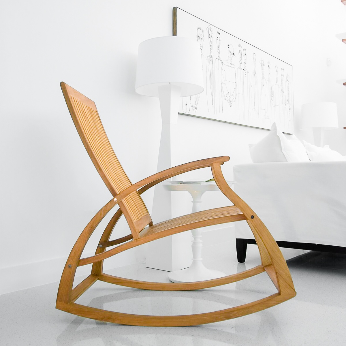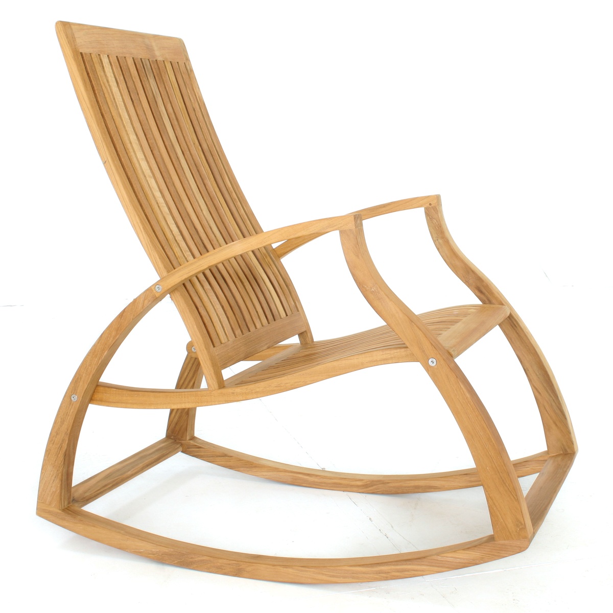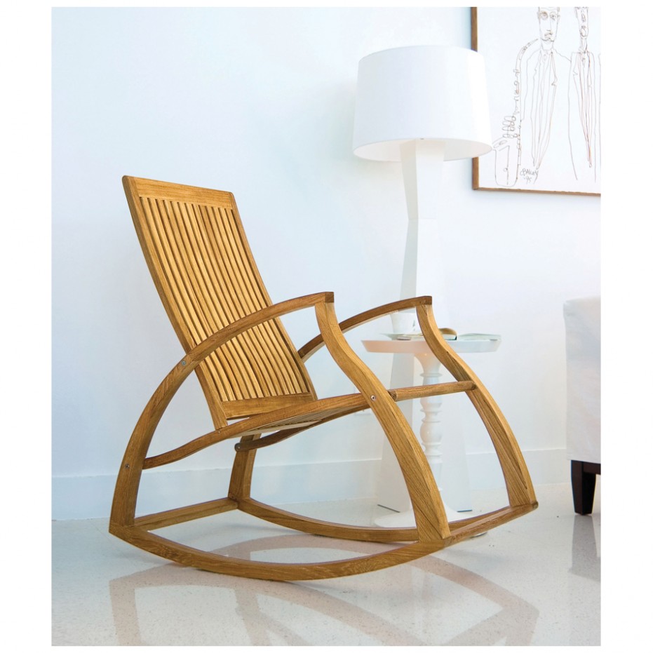 Defined by its sensuous curves and sweeping fluid lines, the Aria Teak Rocker is bound to be the conversational piece in any room or space.  The Aria rocking chair is ergonomically designed with a contoured backrest and seat to maximize hours of comfortable seating, even without cushions. The extended rocking-arc and slightly tilted stance of the chair provides a pleasurable and gentle rocking motion.
