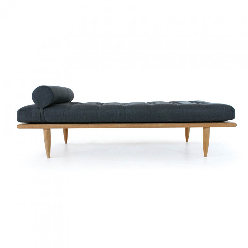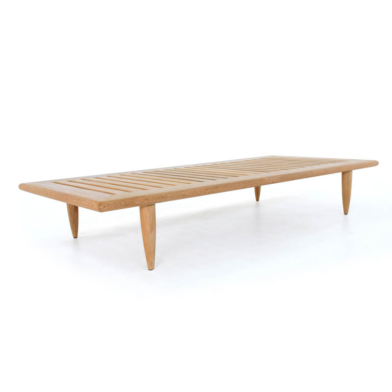 Inspired by the mid-century style, the Saloma daybed lives up to its iconic form and understated glamour. Defined by its superior craftsmanship and simple sophistication, its simple frame, made of un-laminated teakwood, is raised upon four elegantly turned solid teak legs, ensuring structural integrity of the furniture. The seat cushion, constructed from three distinct layers of foam cores are individually hand tufted and double stitched. Surprisingly luxurious and soft to the touch, the stock fabric cover is specified for interior use, as well as outdoors.