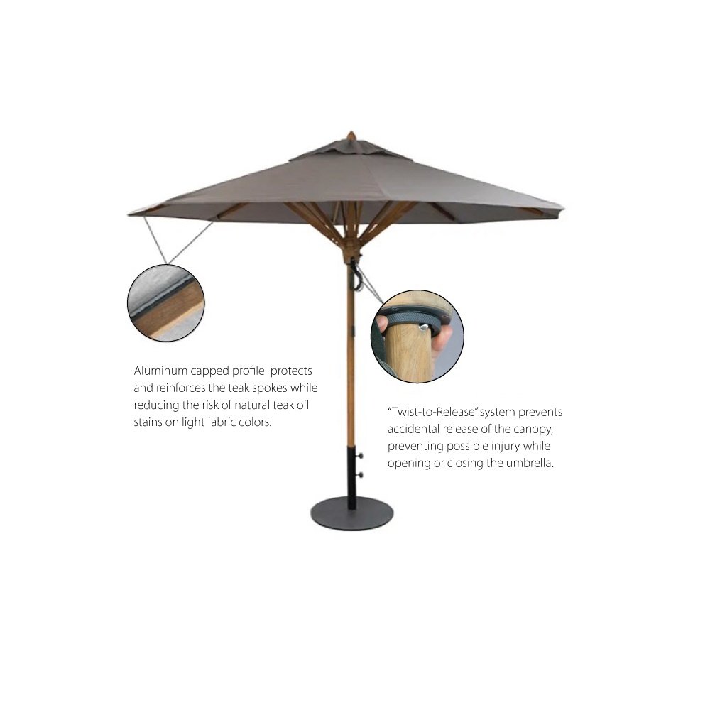 The WT Round Umbrella is 10ft. tall and has a pole 1 7/8 inches in diameter for strength and stability, built to last through any weather, year after year. Will be shipped with instock Awning White Sunbrella fabric or a choice of made to order fabric colors (shipped separately). A variety of colors are available to best suit any taste and style. Depending on the teak table selected, a parasol base may or may not be necessary.