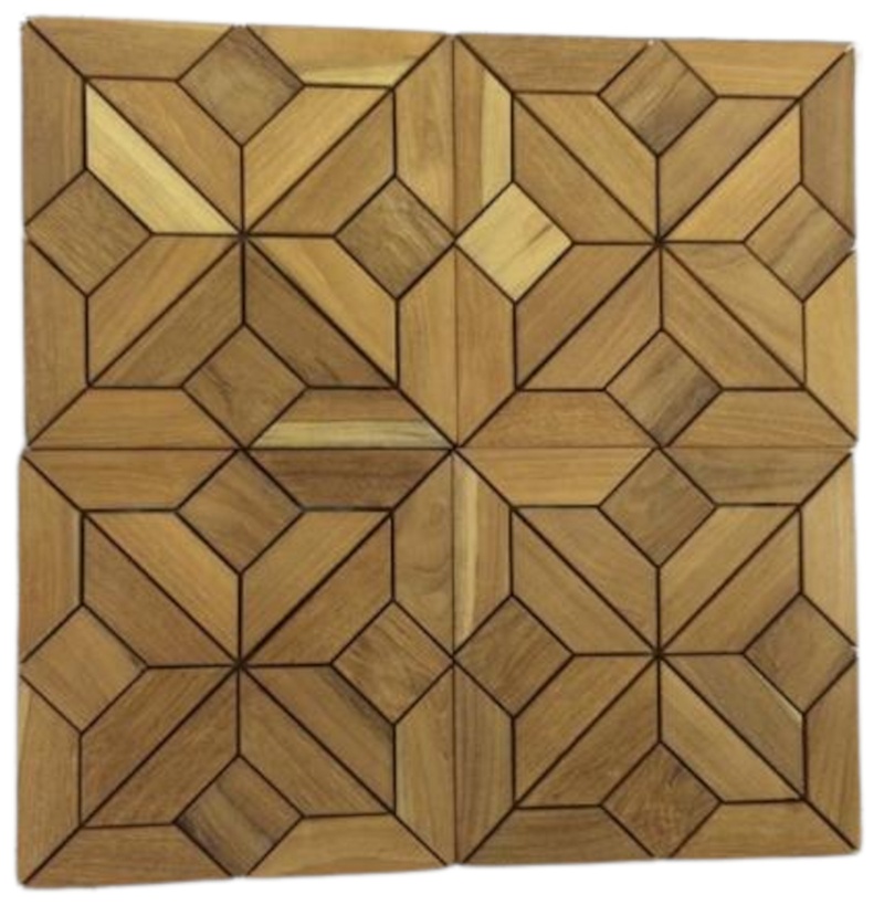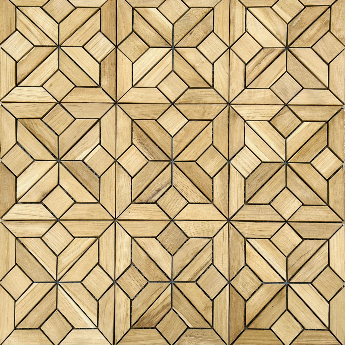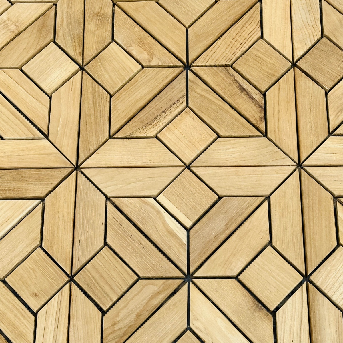 Exclusively crafted for Westminster, the Fez, or otherwise described as Marrakech teak tiles, introduce an elegant arabesque design that brings a touch of Moroccan chic to any space. Featuring a clever interplay of just two distinct geometric shapes on each tile, the design allows you to effortlessly weave (or click) them into a tapestry of exquisite tile work in a relatively short time, adding an artistic dimension to your environment.
