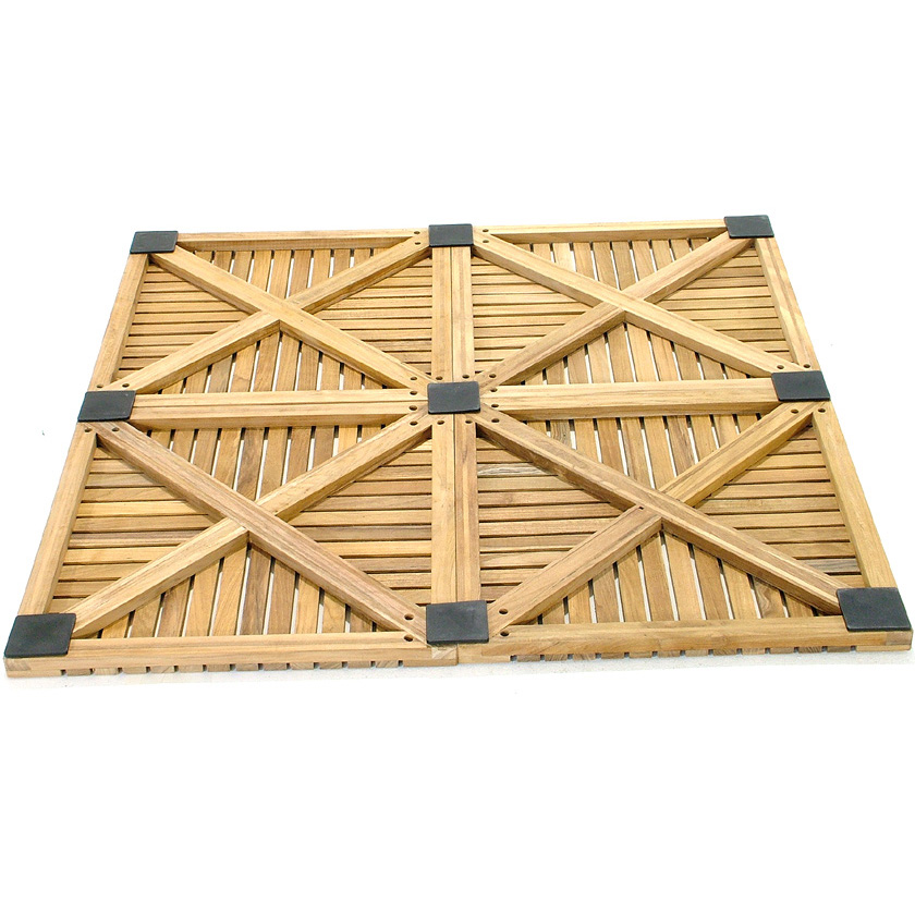 Our Diamond teak bath mats are sold as one carton, containing four (4) teak mat sections and (9) plastic connectors , covering 10.75 square feet per carton. Each teak bath mat has 4 predrilled holes in the corners that allow them to be installed using the plastic connectors.  Installation is easy, simply place connector on the floor with prongs sticking up then place the tiles on top of the connectors inserting the prongs into the predrilled holes. The tiles then rest in place firmly on top of the connectors. These tiles require no tools to install or remove for cleaning.