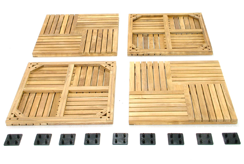 Sold as one carton containing four teak Bath Mat units. One carton covers 10.75 square feet. Each tile has 4 predrilled holes in the corners that allow them to be installed using the plastic connectors. Installation is easy, simply place connector on the floor with prongs sticking up then place the tiles on top of the connectors inserting the prongs into the predrilled holes. The teak mats then rest in place firmly on top of the connectors. These mats require no tools to install or remove for cleaning.