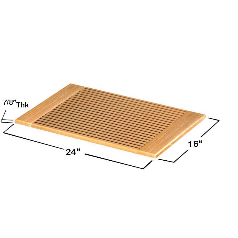 Our Pacifica teak bath mat is meticulously hand crafted from solid Grade A certified teak. Each machined slat is carefully assembled in the traditional method, without any screws or nails. Both beautiful and practical, our maintenance-free teak bath mats will not hold water like towel or other fabric type bathmats. Low profile height (7/8") and smooth rounded edges. Rubber pads are attached to the bottom of our teak bath mats to assure the user of security against slippage.