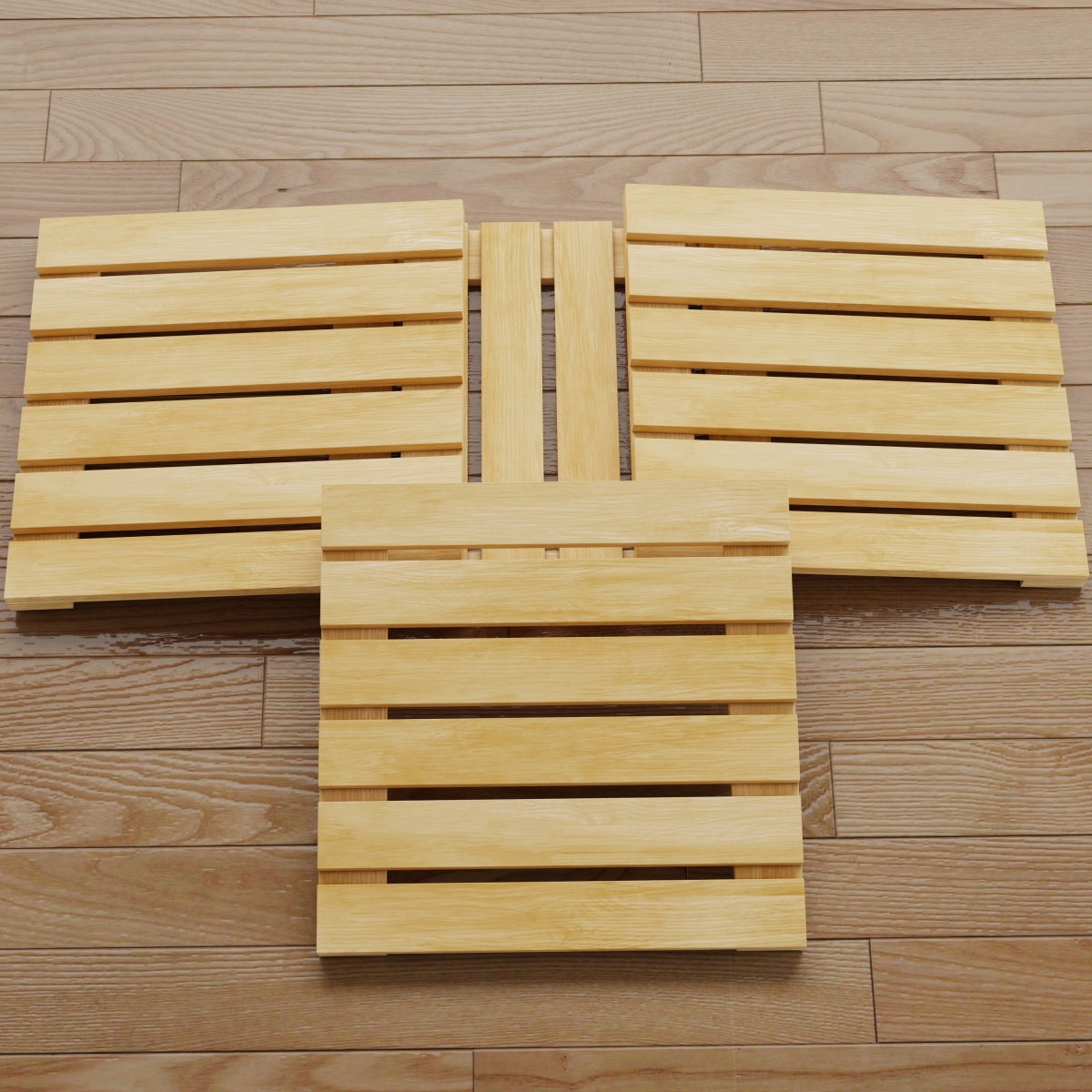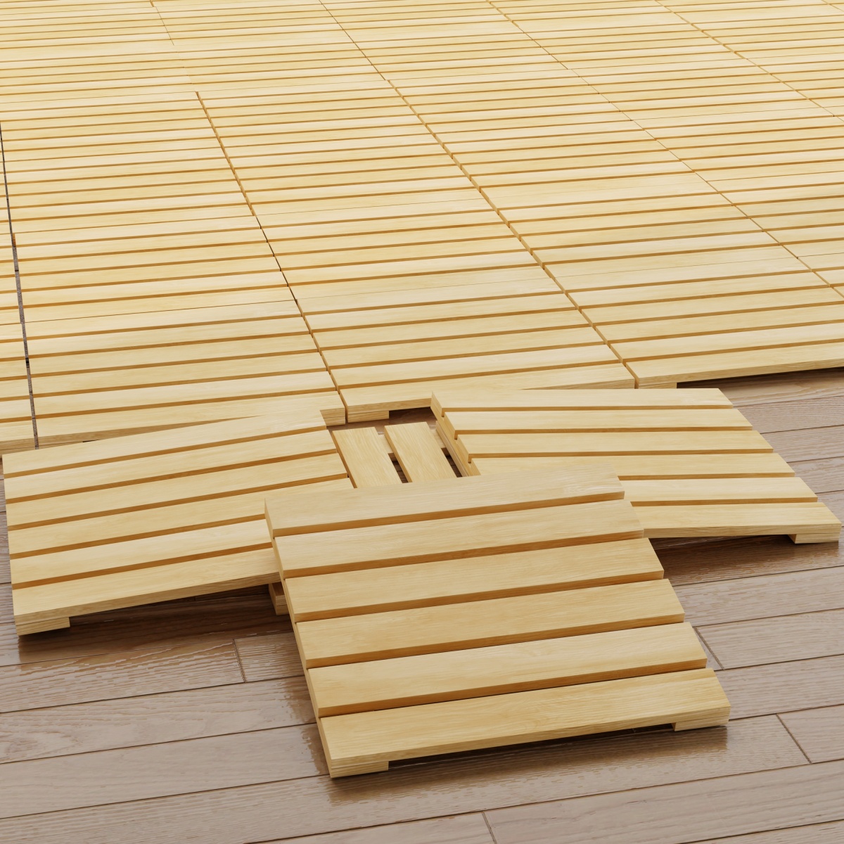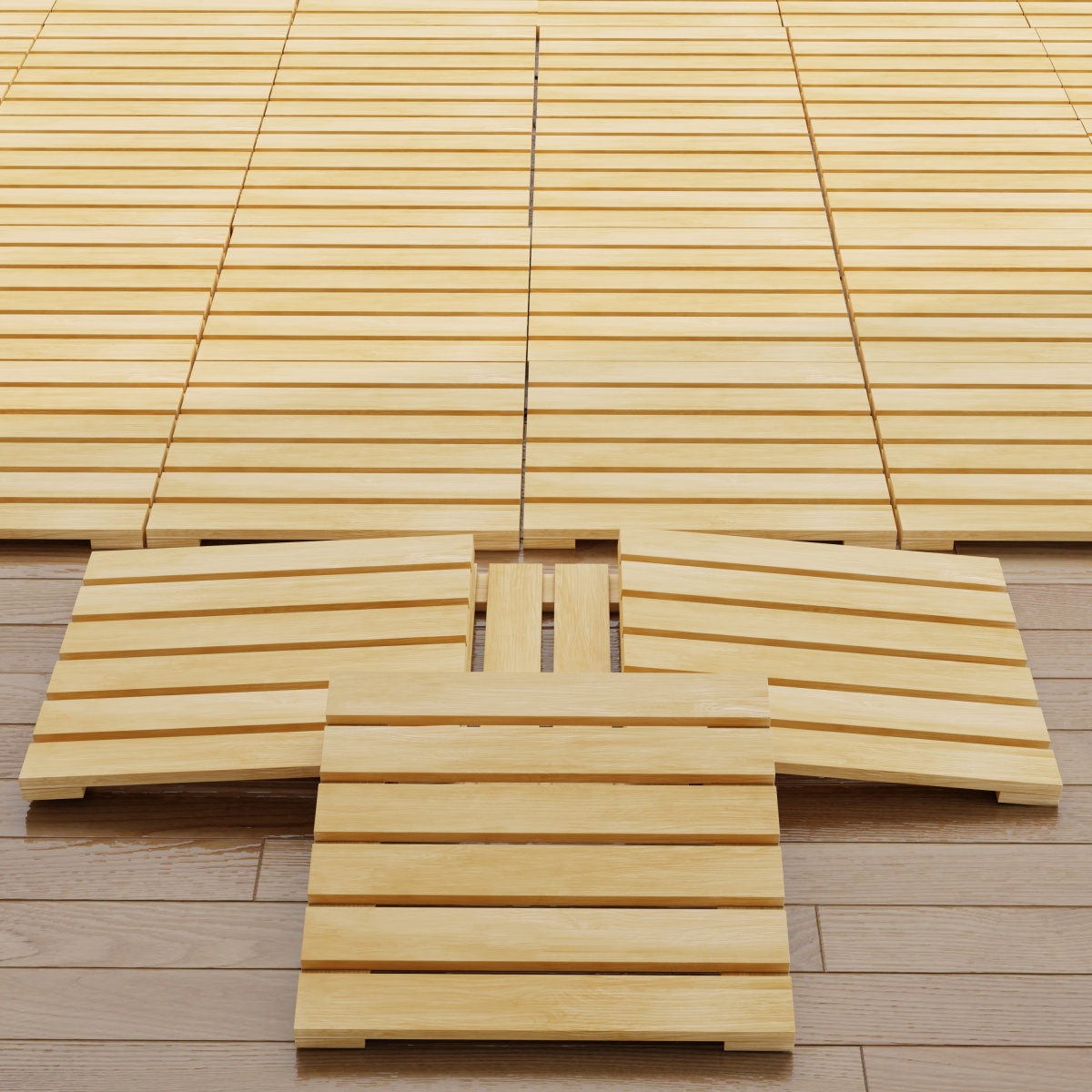 •The Callebotise tiles (18403 and 18490) are the only all-wood tiles in our collection that do not include a plastic underlay and can be used as bath mats. Tile connections for these models are made with plastic prong connectors at the corners of the tiles.