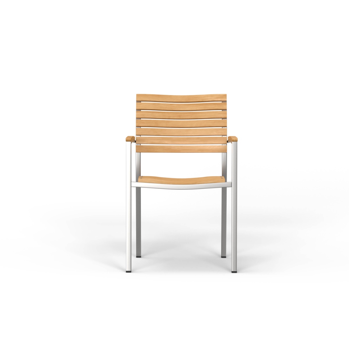 With the interplay of 304 Stainless Steel and Teak Wood, the Vogue Stacking Dining Chair defines contemporary dining. A curved backrest and seat offer lasting comfort even without cushions while the chair's architectural details provide a distinct modern appeal.