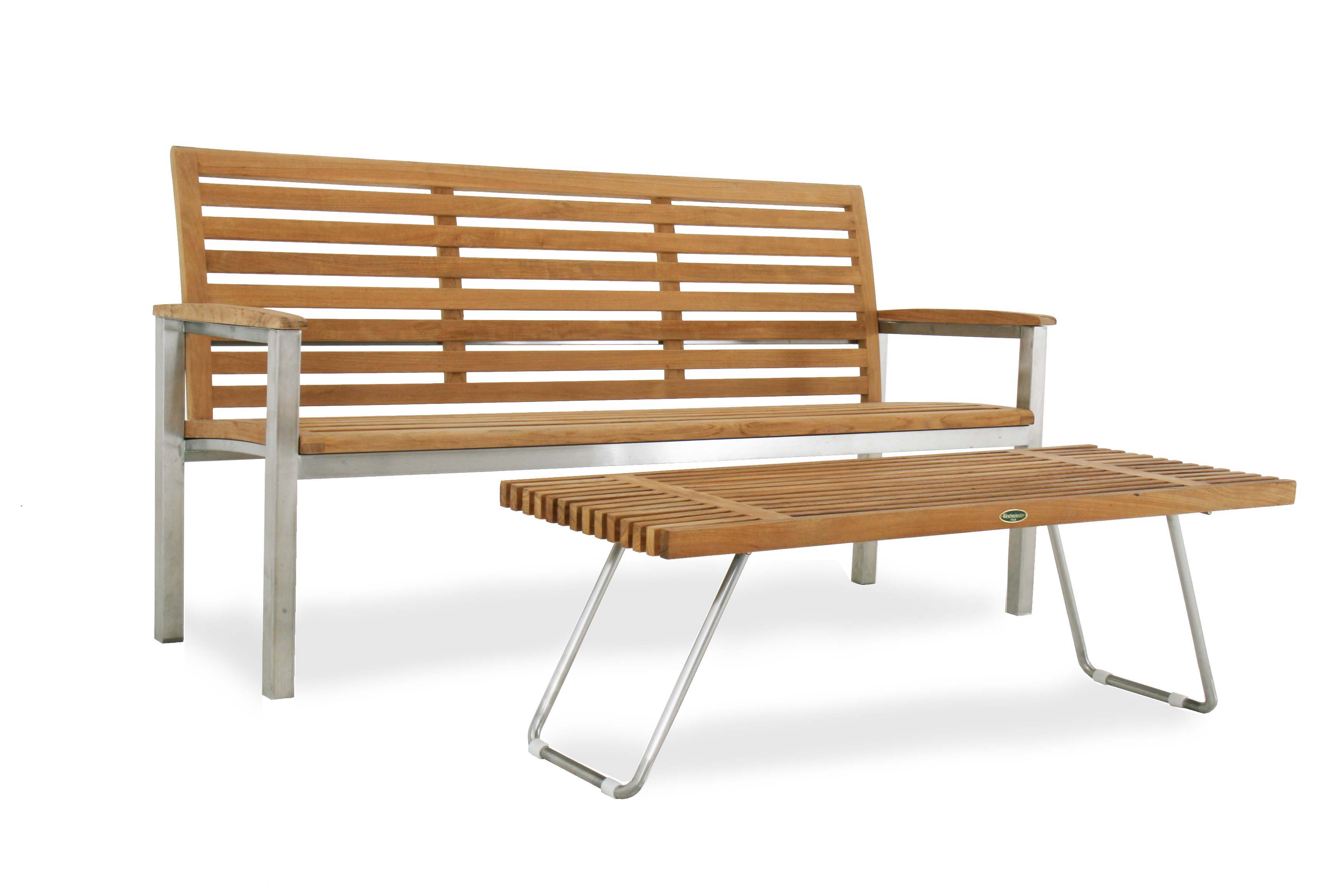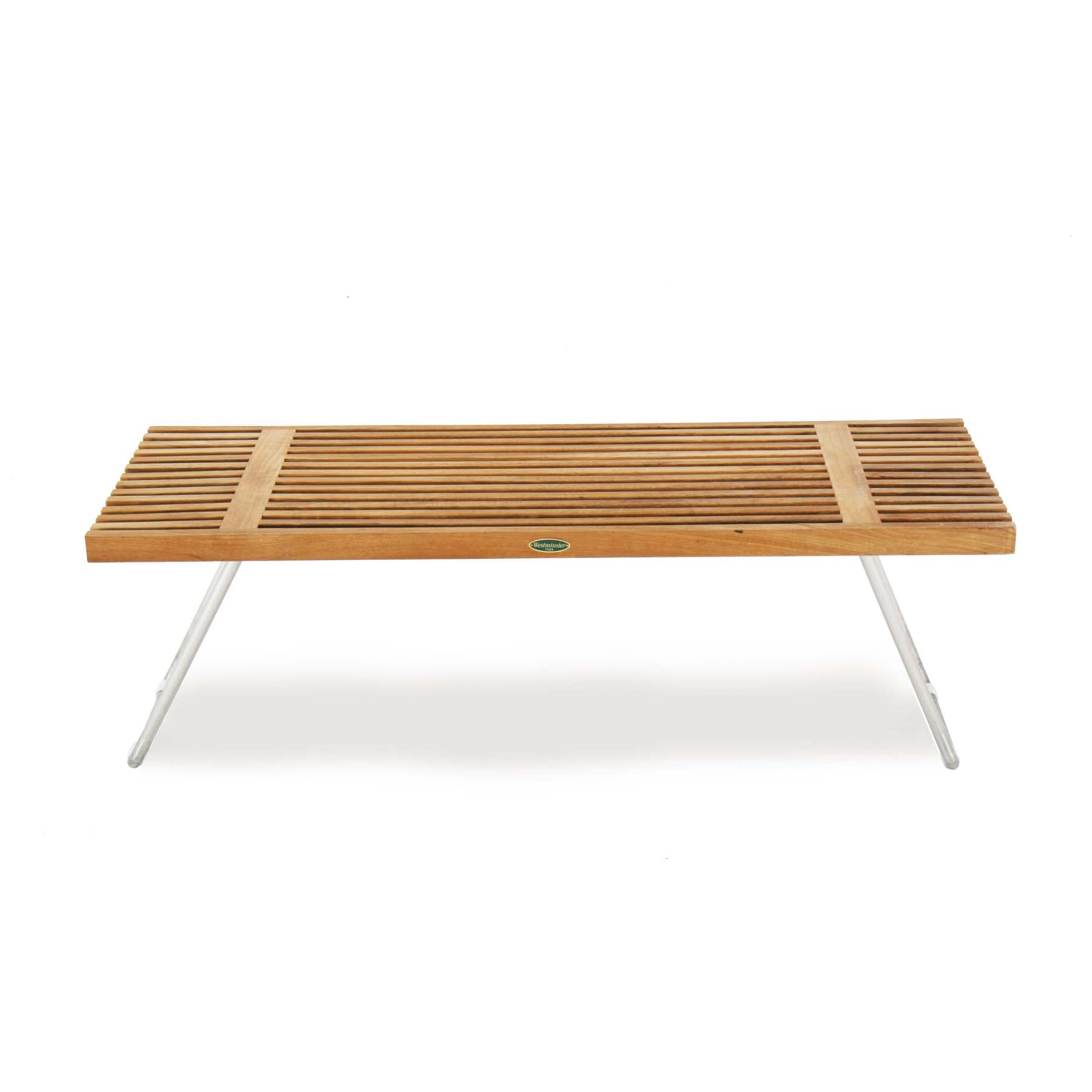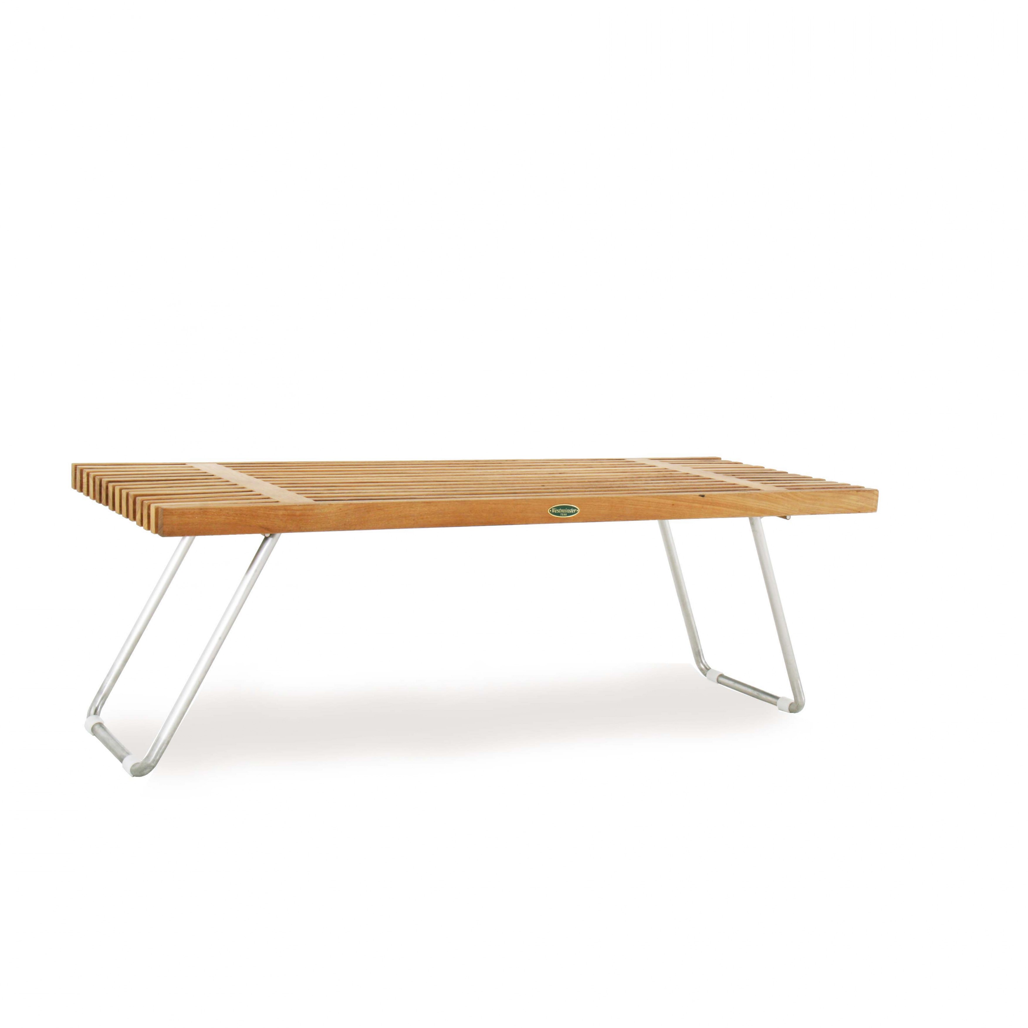 Teak Stainless Folding Coffee Table has a unique combination of stainless steel and teak wood. Legs fold in for easy transport. Portable.