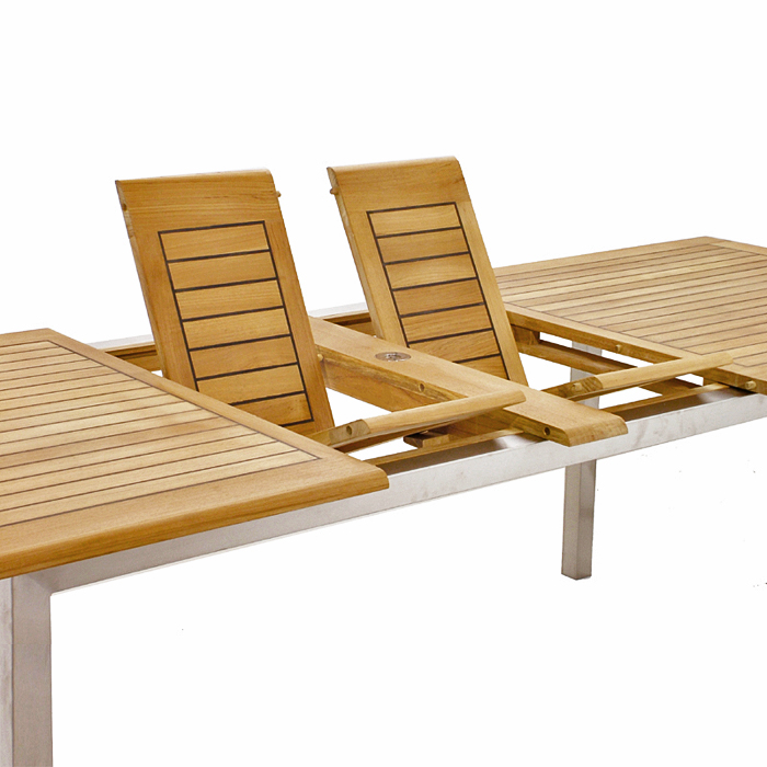 The Vogue Extension Table accommodates an optional 2" diameter Teak Umbrella in any collapsed or extended position. Plastic glides cap the stainless steel legs to prevent scratches on any surface, indoors or out.