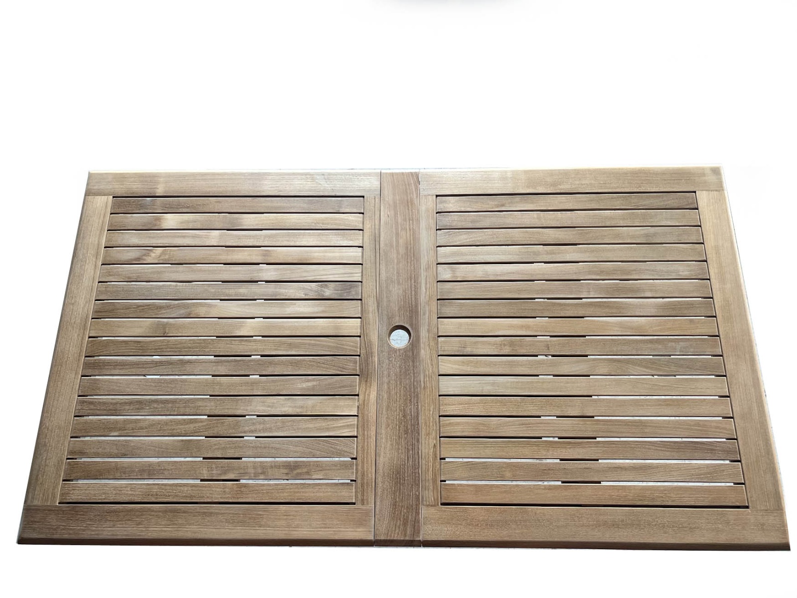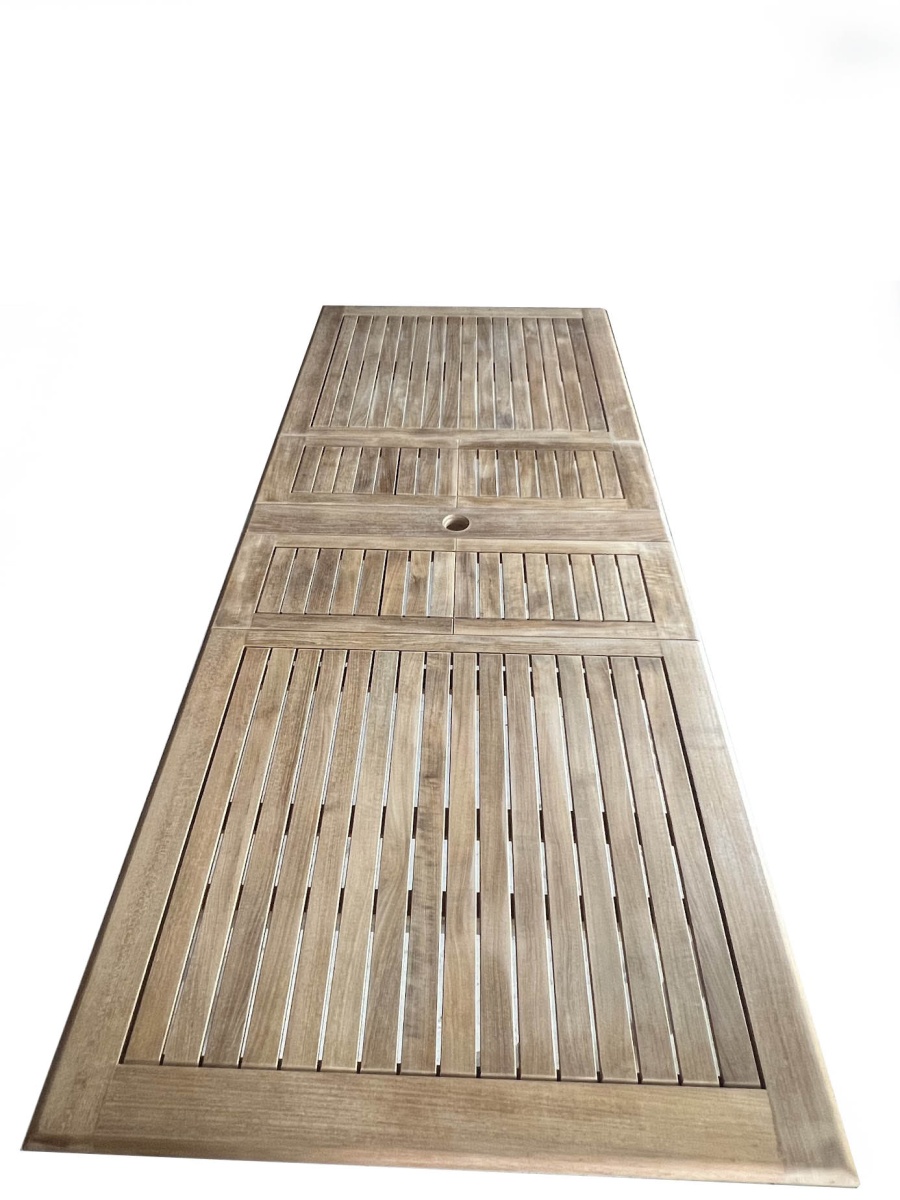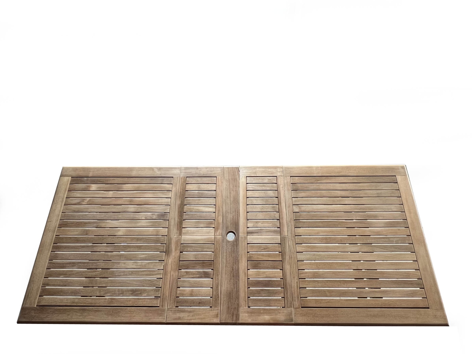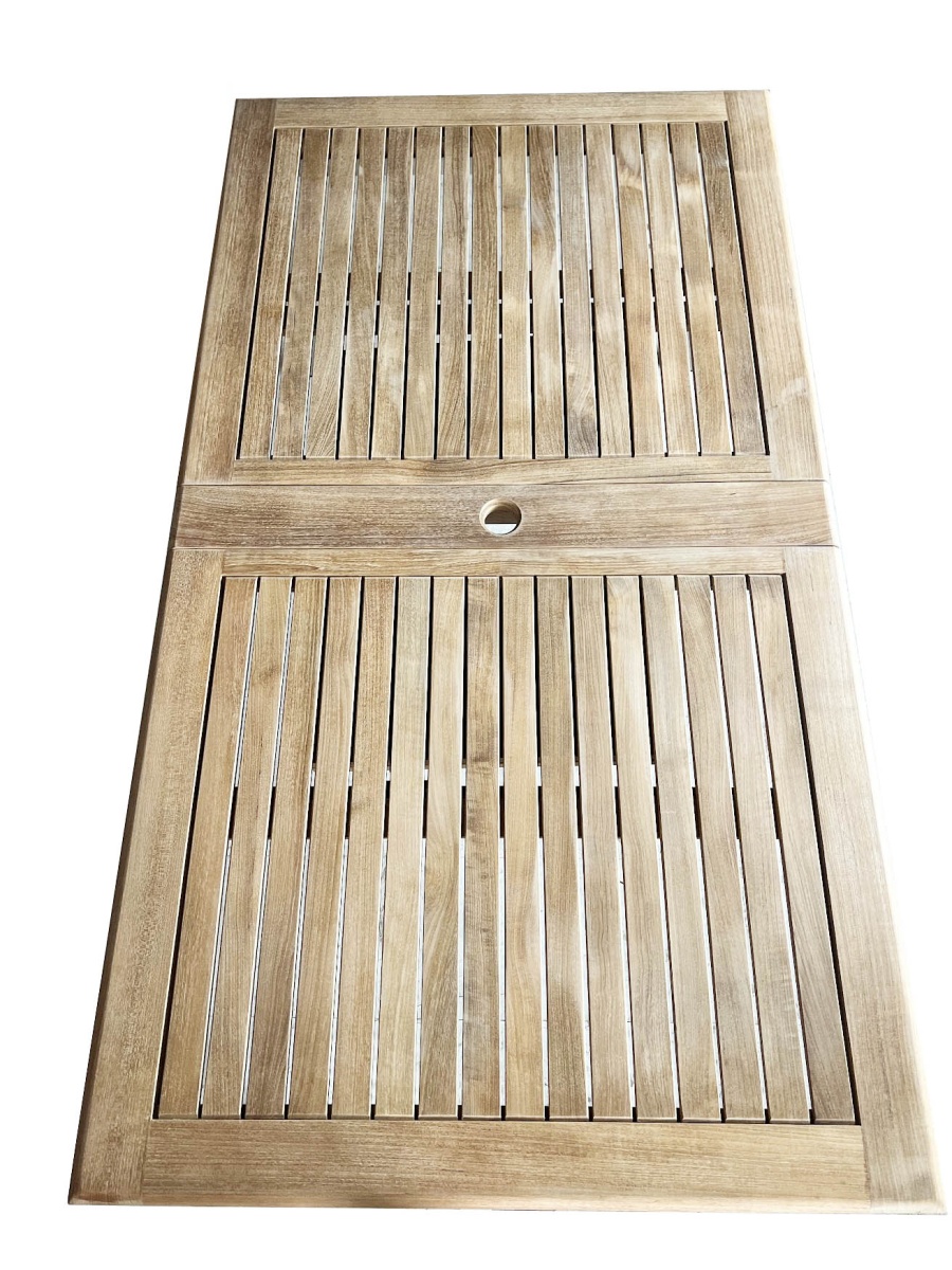 The Vogue Extension Table accommodates an optional 2" diameter Teak Umbrella in any collapsed or extended position. Plastic glides cap the stainless steel legs to prevent scratches on any surface, indoors or out. This Vogue Extension table DOES NOT have Sikaflex Marine Sealant between Slats.