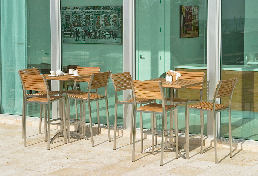 With the interplay of 304 Stainless Steel and Teak Wood, the Vogue Square Bar Table defines contemporary dining. Standing at 40 inches high and 30 inches x 30 inches square, it can seat up to four. The tabletop is caulked with Sikaflex, a high-grade polyurethane sealant that prevents liquids from seeping through while providing a nautical appeal. Part of the Vogue Collection.