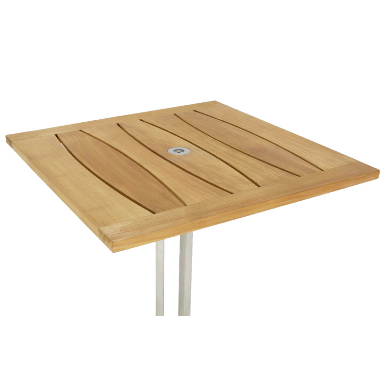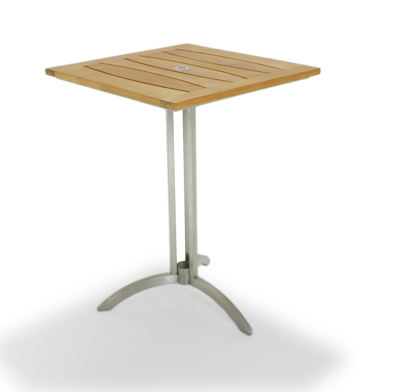 The Venezia square pub table is distinctly designed using a combination of our premium grade A teak and marine grade stainless steel to create a striking curved teak slat pattern over a pedestal of durable stainless steel.