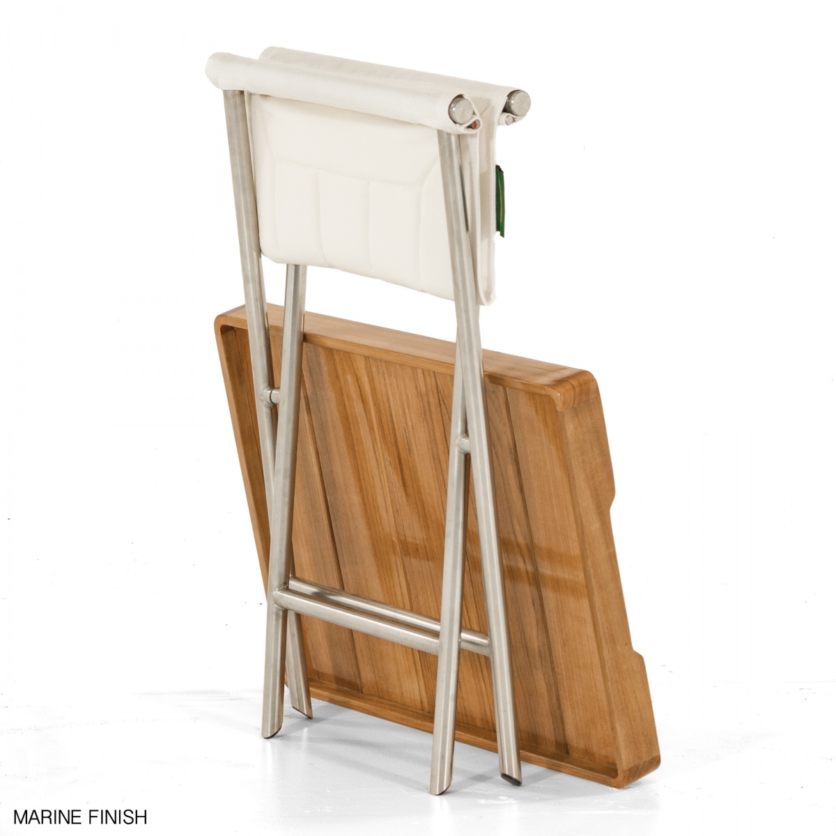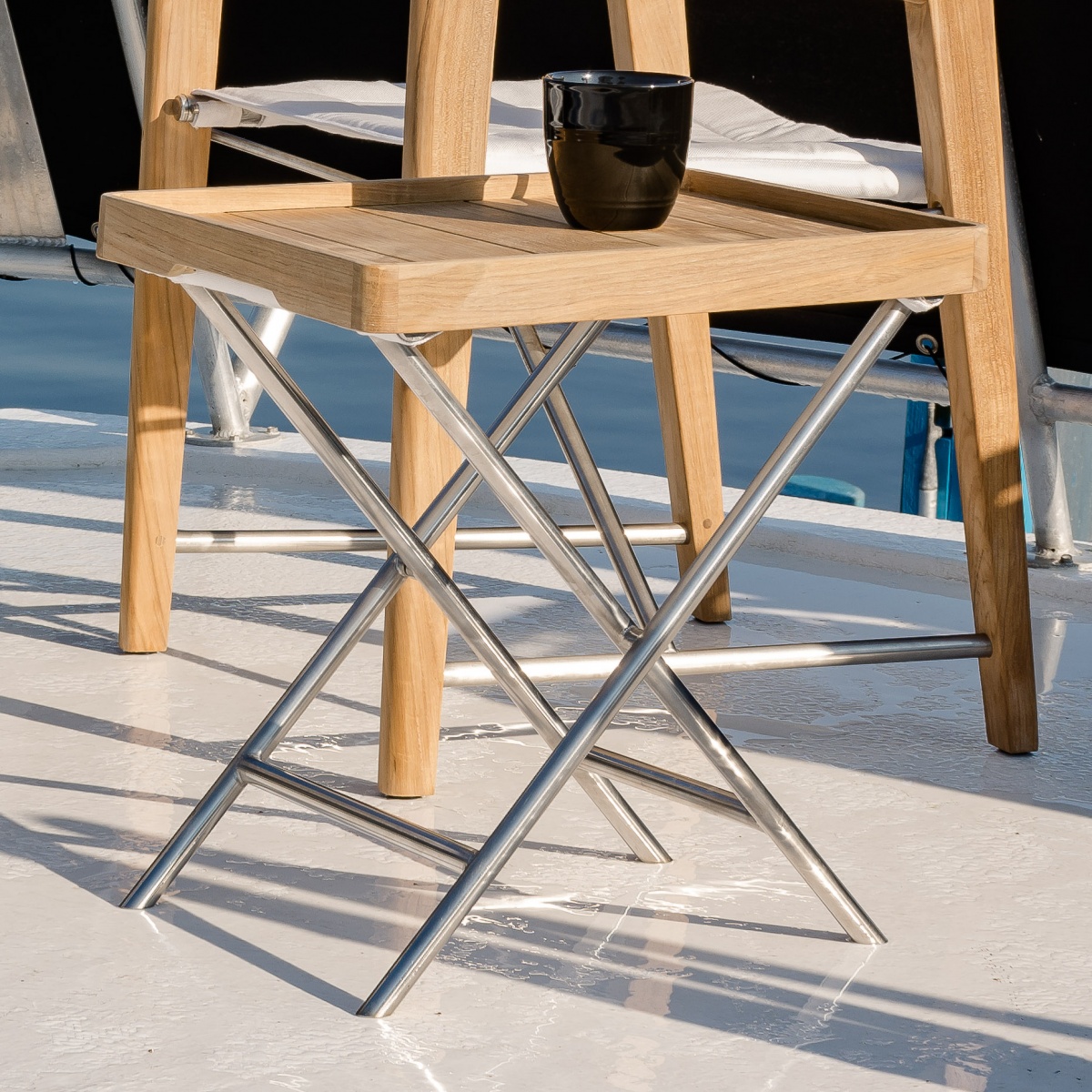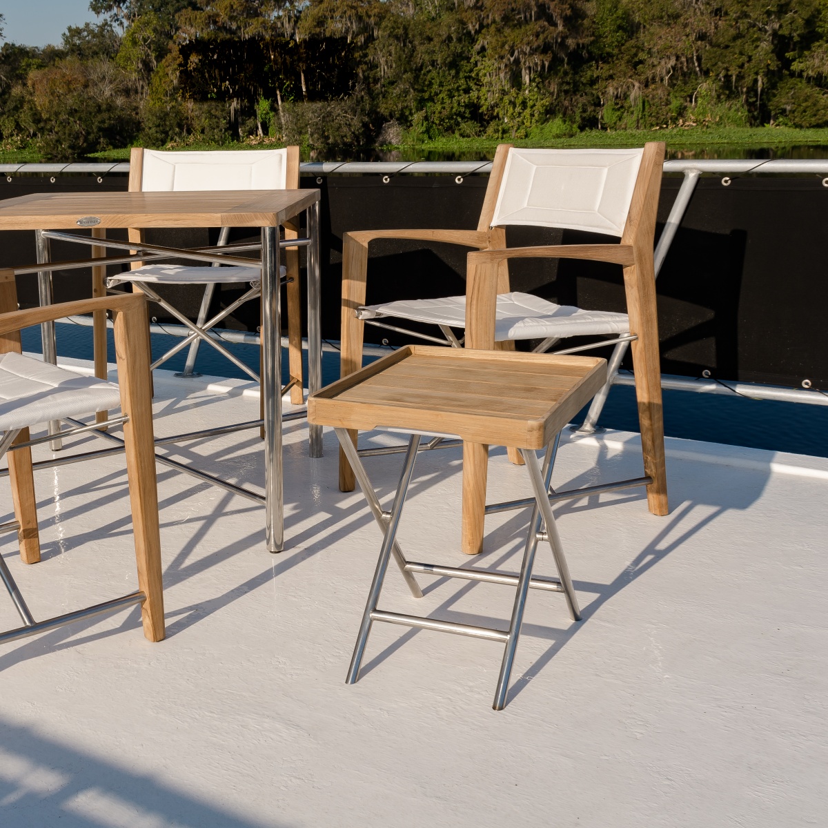 Made of 316L marine grade stainless steel and part of the Odyssey Collection, the Odyssey Folding Ottoman is a light-weight, compact, yet highly functional piece of furniture. From extra seating to a footrest, or as a side table with its companion teak tray, the simple versatility of this Ottoman makes it a practical choice. Like every piece of the Odyssey Collection, it will fit seamlessly on the deck of a yacht, the balcony of a high-rise, or the poolside of a home. Folds completely for easy storage.