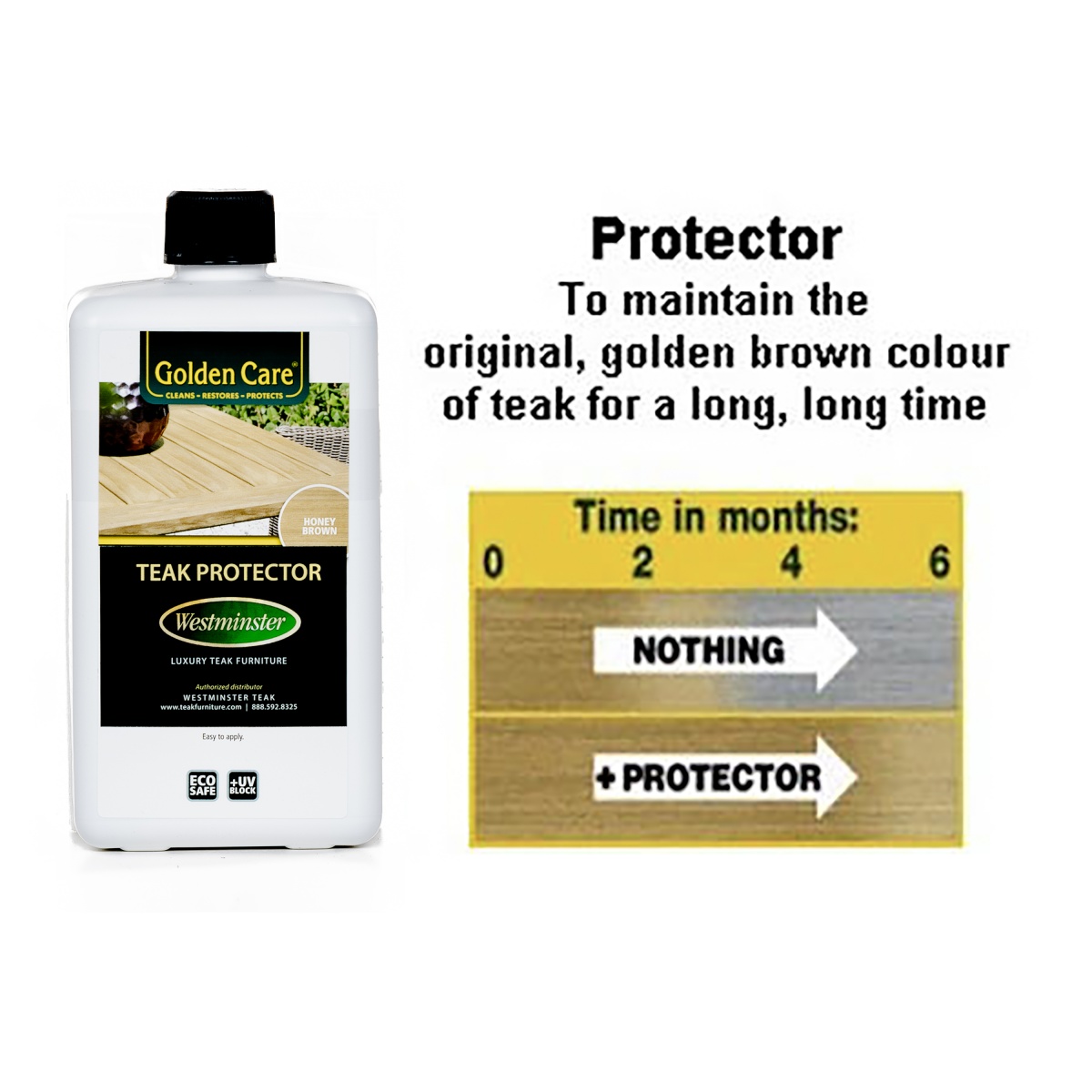 I applied Teak Protector to my outdoor teak furniture after cleaning the furniture thoroughly with the Westminster Teak Cleaner. I was a little concerned about the label instructions to test the Cleaner first on a small, non-visible area of the furniture because I didn't want to change the finish. While the Cleaner appears quite dark out of the bottle, it faded to a "non-finish" shade and brought out the natural colors of all the wood. My furniture was wonderful again and looking like new after 24 hours. I'm very happy. One other note: the instructions say to put down a dropcloth or plastic covering under the furniture before applying the protector, and you should definitely do this. The protector will leave a visible stain on uncovered stone / brick surfaces.