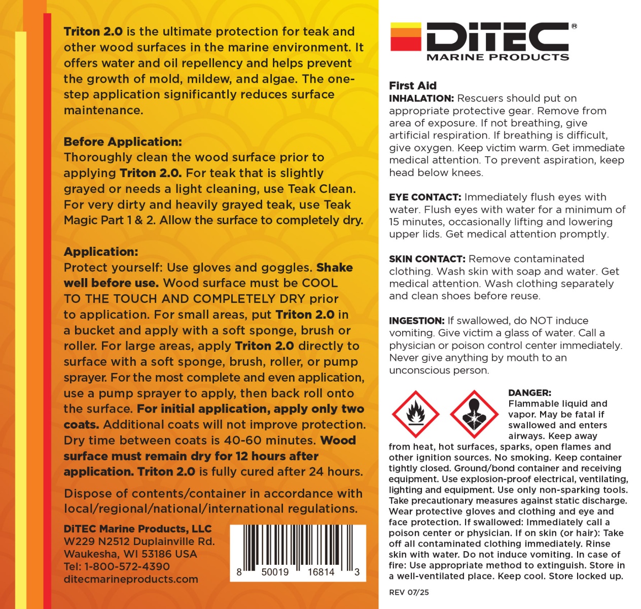 Before Application: Thoroughly clean the wood surface prior to applying Triton 2.0. For teak that is slightly grayed or needs a light cleaning, use Teak Cleaner. For very dirty and heavily grayed teak. Allow the surface to completely dry. Application: Protect yourself: Use gloves and goggles. Shake well before use. Wood surface must be COOL TO THE TOUCH AND COMPLETELY DRY prior to application. For small areas, put Triton 2.0 in a bucket and apply with a soft sponge, brush or roller. For large areas, apply Triton 2.0 directly to surface with a soft sponge, brush, roller, or pump sprayer. For the most complete and even application, use a pump sprayer to apply, then back roll onto the surface. For initial application, apply only two coats. Additional coats will not improve protection. Dry time between coats is 40-60 minutes. Wood surface must remain dry for 12 hours after application. Triton 2.0 is fully cured after 24 hours.