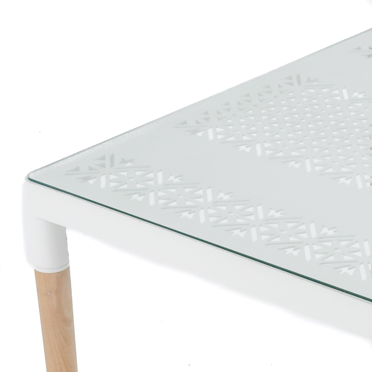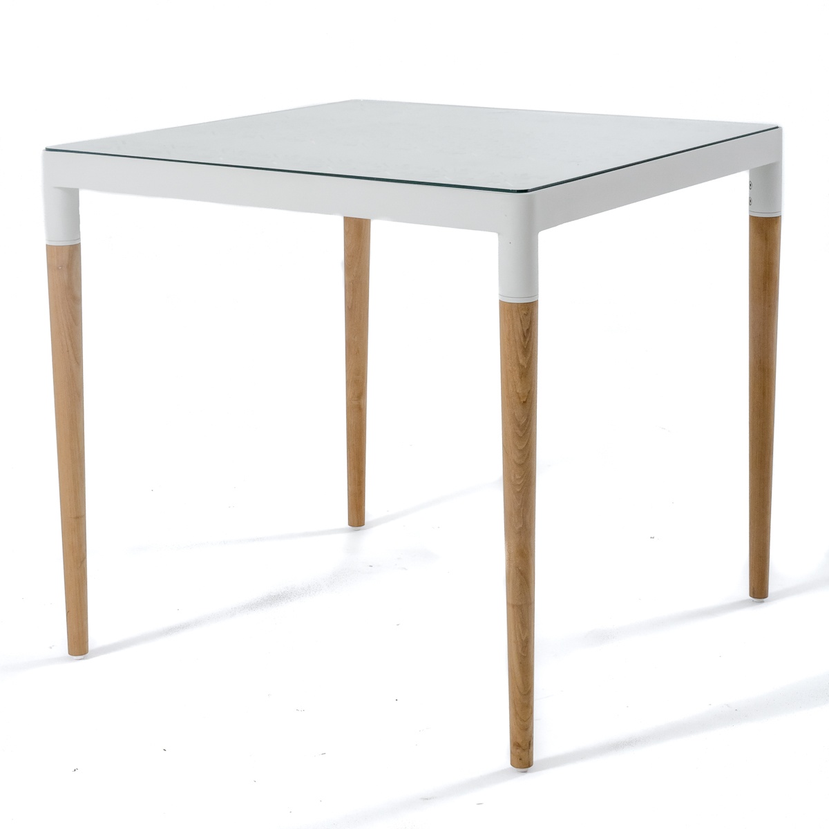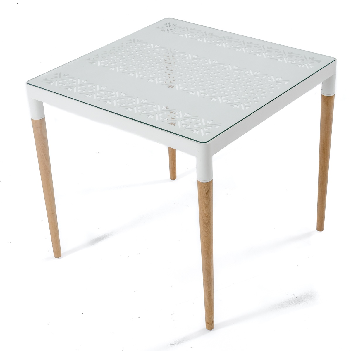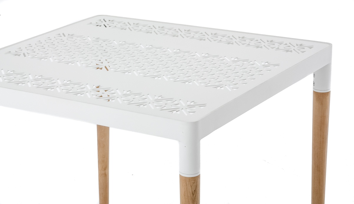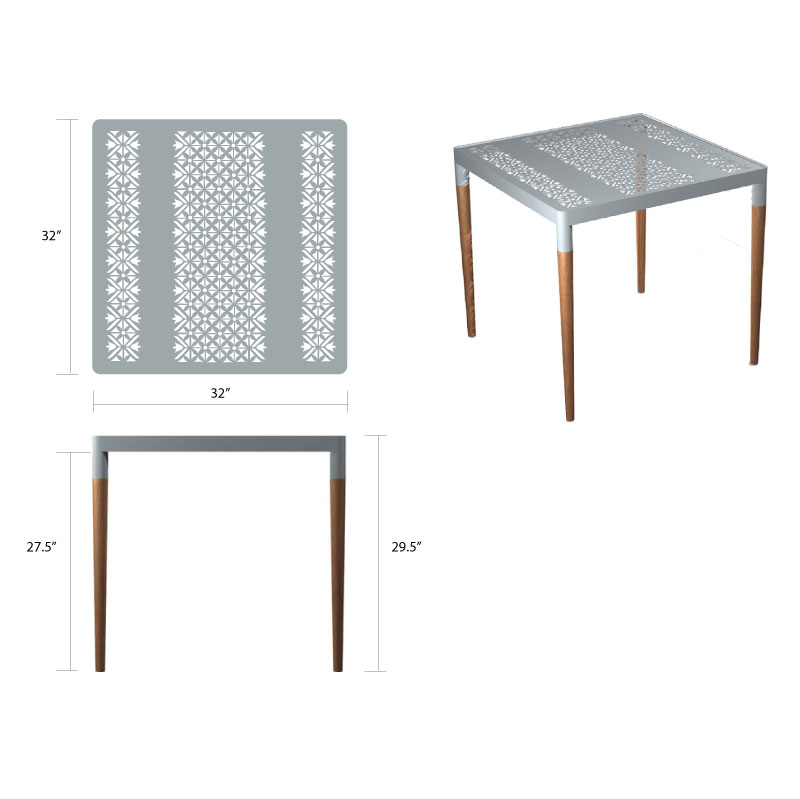 With its fresh take on tabletop design, the Bloom table brings a new dimension to outdoor dining and style.  Using the latest water-jet technology, the powder-coated aluminum tabletop is precision cut in the lively pattern of spring flowers in bloom. The interplay of shadows casted in outdoor sun further enhances the tables captivating delight outdoors. Beautifully tapered solid teak legs add an element of warmth to the otherwise cool aluminum top.