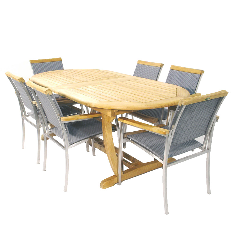 Entertain your guests in style with this elegant teak wood patio furniture set. Crafted from Indonesian teak consisting of 1 Montserrat Teak Extension Table, 6 SS Kelly Aluminum Teak Arm chairs to complete this lovely Teak Outdoor Set. Teak Lazy Susan is sold separately.