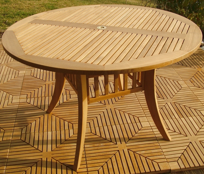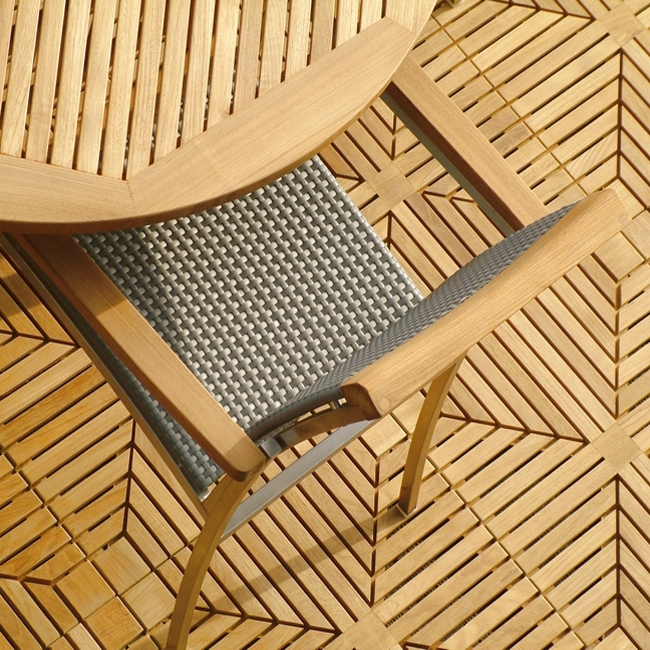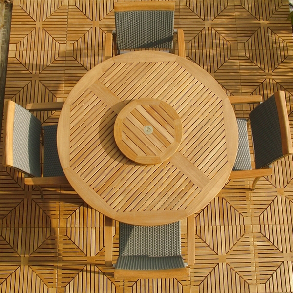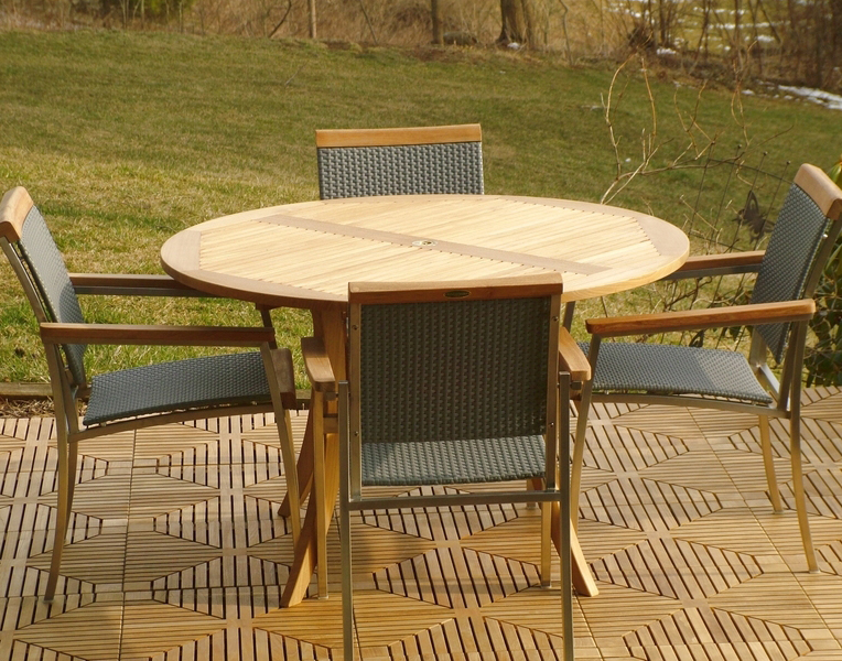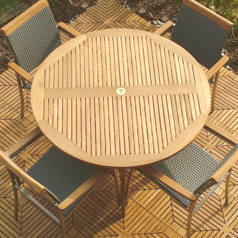 A round teak dining set that provides ample room for everyone, and supporting comfort with every guest getting the benefit of arm support. This beautiful teak patio furniture set includes 1 Grand Hyatt 4FT Teakwood Table and 4 Westminster SS Kelly Stacking Chairs Shown with optional teak Lazy Susan, Diamond Teak Tiles and Umbrella. Click Next and Previous to see more photos.