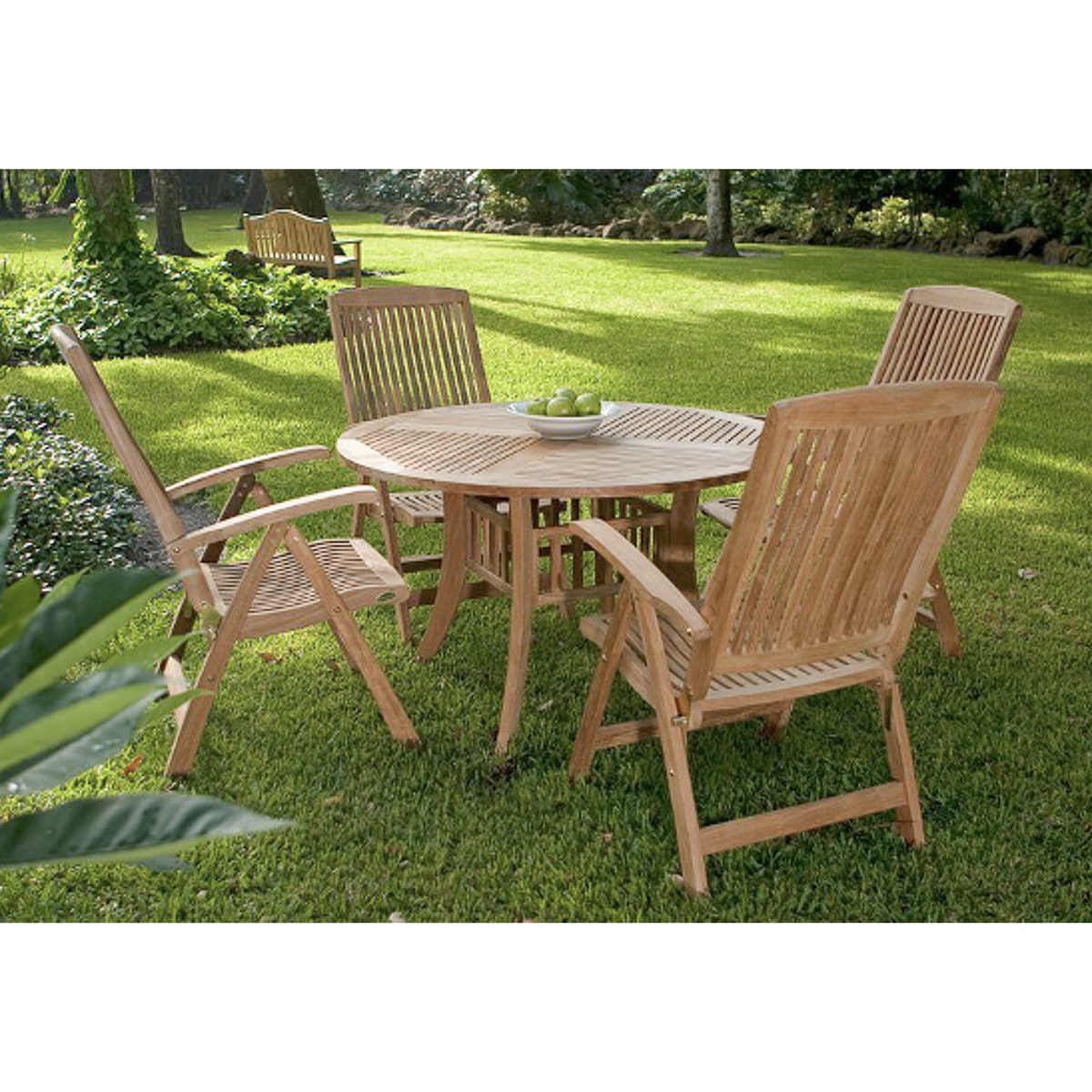 With style and sophistication to patio, deck and front porch of your home, this classic teak outdoor furniture set includes four Westminster Reclining Armchairs combined with a Grand Hyatt Teak table that has our new blocked leg design.