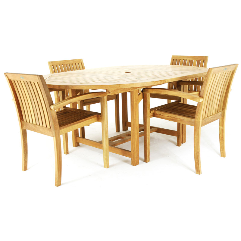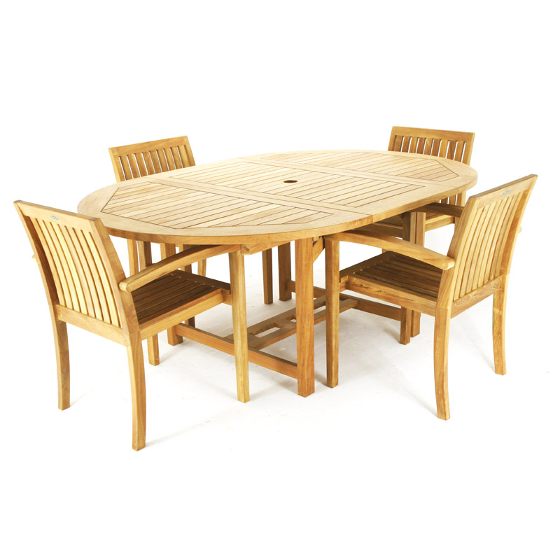 This lovely set comes with a Martinique Extension Table and 4 teak stacking armchairs.