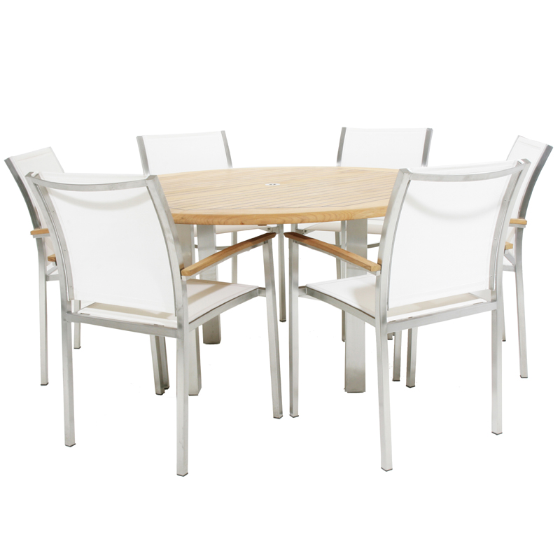The Gemini 5 ft. round dining set is a uniquely modern interplay of two very durable materials for outdoor use, featuring (1) stainless steel and teak outdoor table sealed with Sikaflex® (for waterproofing) between slats, (6) stainless steel and teak stacking armchairs with high performance UV and tear resistant white Textilene®, a durable PVC coated fabric that is both mildew resistant and flame retardant. The strong breathable mesh conforms to the shape of the human form while allowing air circulation at contact points, which makes seating very comfortable. Chair stacks four high for easy storage.