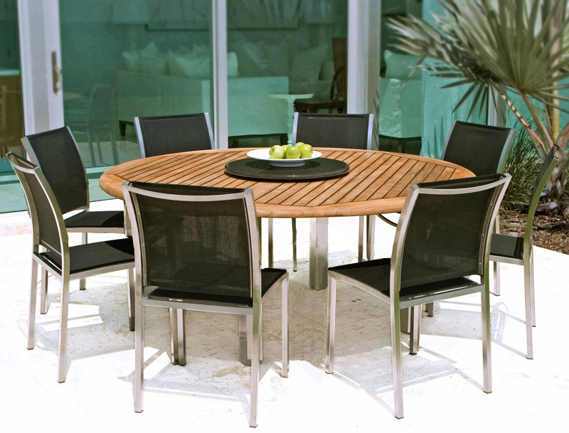 The Gemini round dining set is a uniquely modern interplay of two very durable materials for outdoor use, featuring (1) stainless steel and teak outdoor table sealed with Sikaflex® (for waterproofing) between slats, (8) stainless steel and teak stacking Dining Chairs with high performance UV and tear resistant Textilene®, a durable PVC coated fabric that is both mildew resistant and flame retardant. The strong breathable mesh conforms to the shape of the human form while allowing air circulation at contact points, which makes seating very comfortable. Chairs stack four high for easy storage. Shown with optional teak umbrella and parasol base.