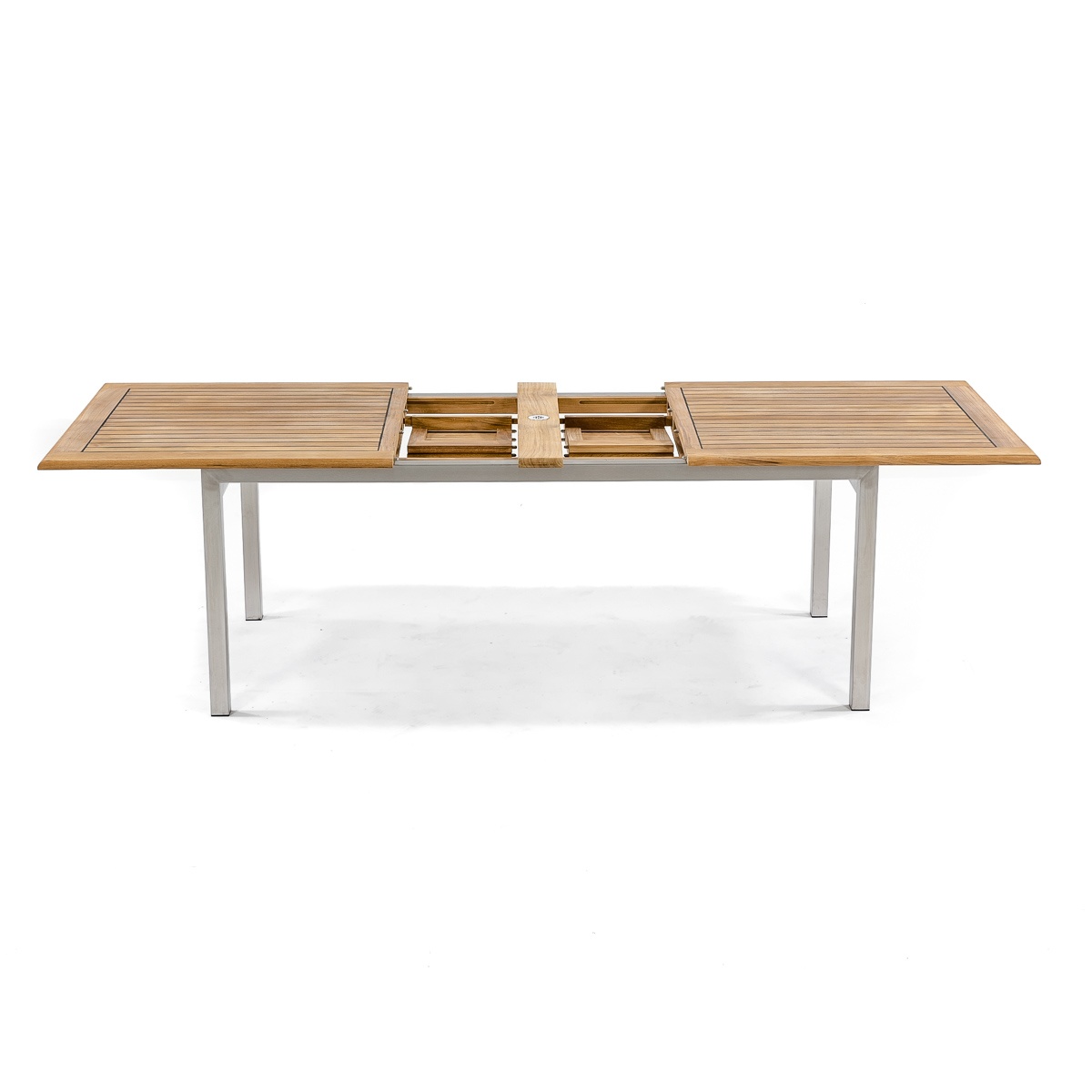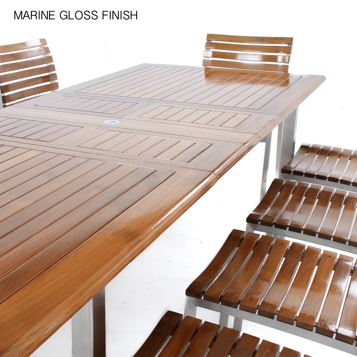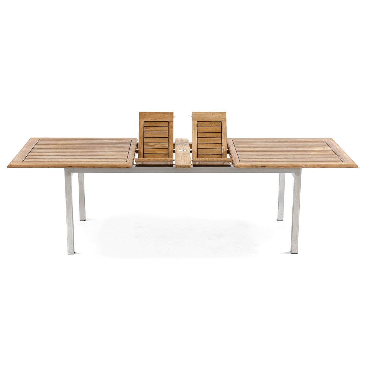 With the interplay of 304 Stainless Steel and Teak Wood, the Vogue Dining Set for 10 defines contemporary dining in the outdoors. The gently curved backrests and scooped seats of the chairs offer lasting comfort even without cushions. The robust Vogue Extension table is caulked with Sikaflex, a high-grade polyurethane sealant that prevents liquids from seeping through while providing a nautical appeal.