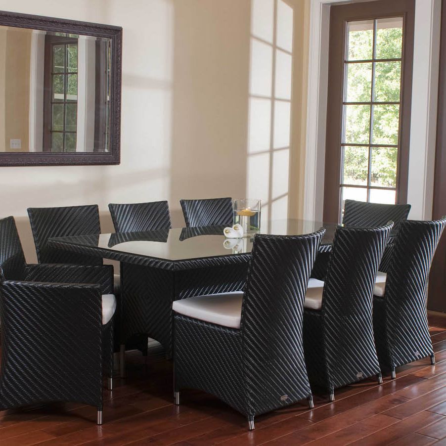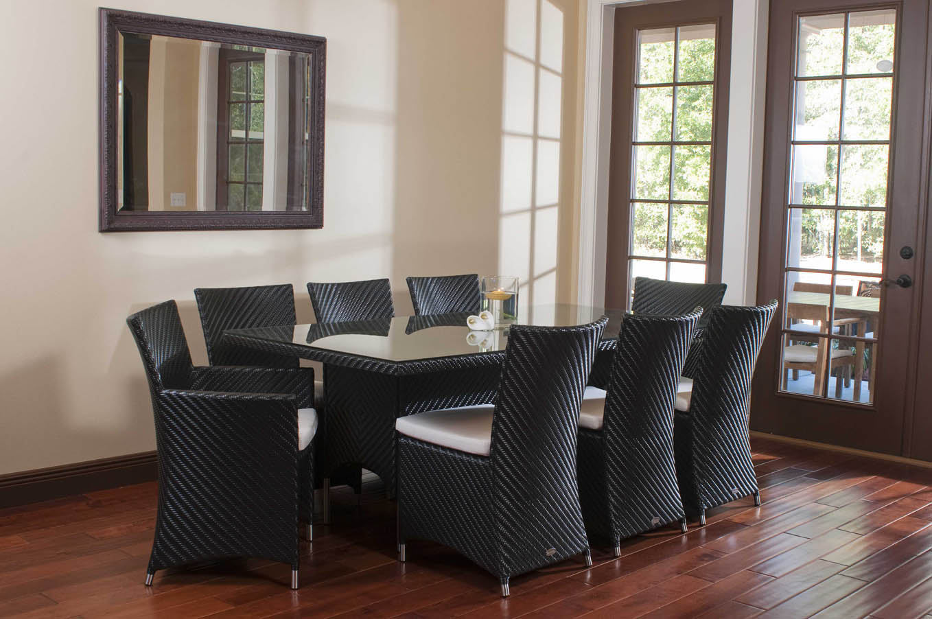 The Valencia All Weather Wicker Dining Set is truly an indoor-outdoor furniture set with style and functionality. Made of durable extruded polyethylene on a powder coated high performance aluminum frame with stainless steel detailing.