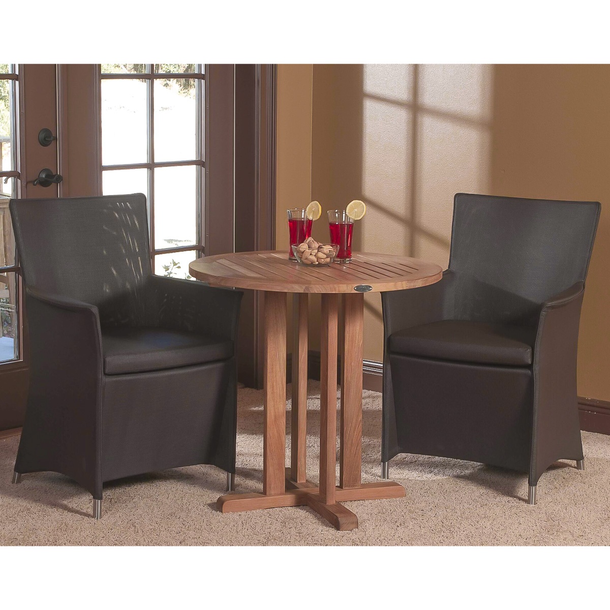 The Apollo Bistro Teak Dining Set consists of 1 Teak Round Bistro Table complemented with 2 Taupe Apollo Armchairs.
