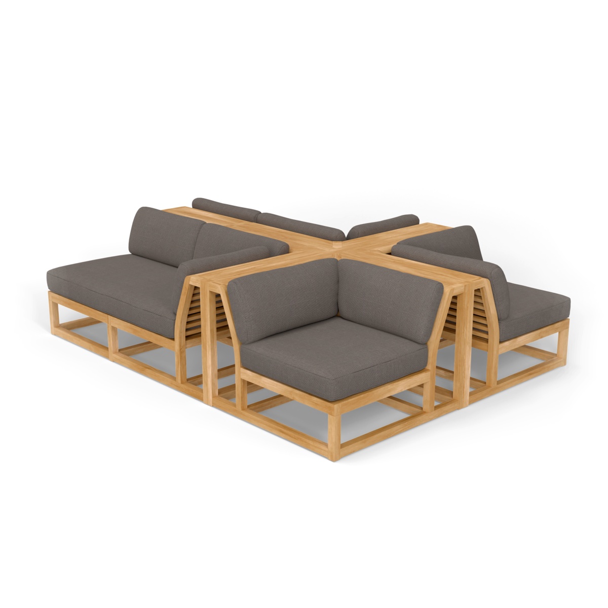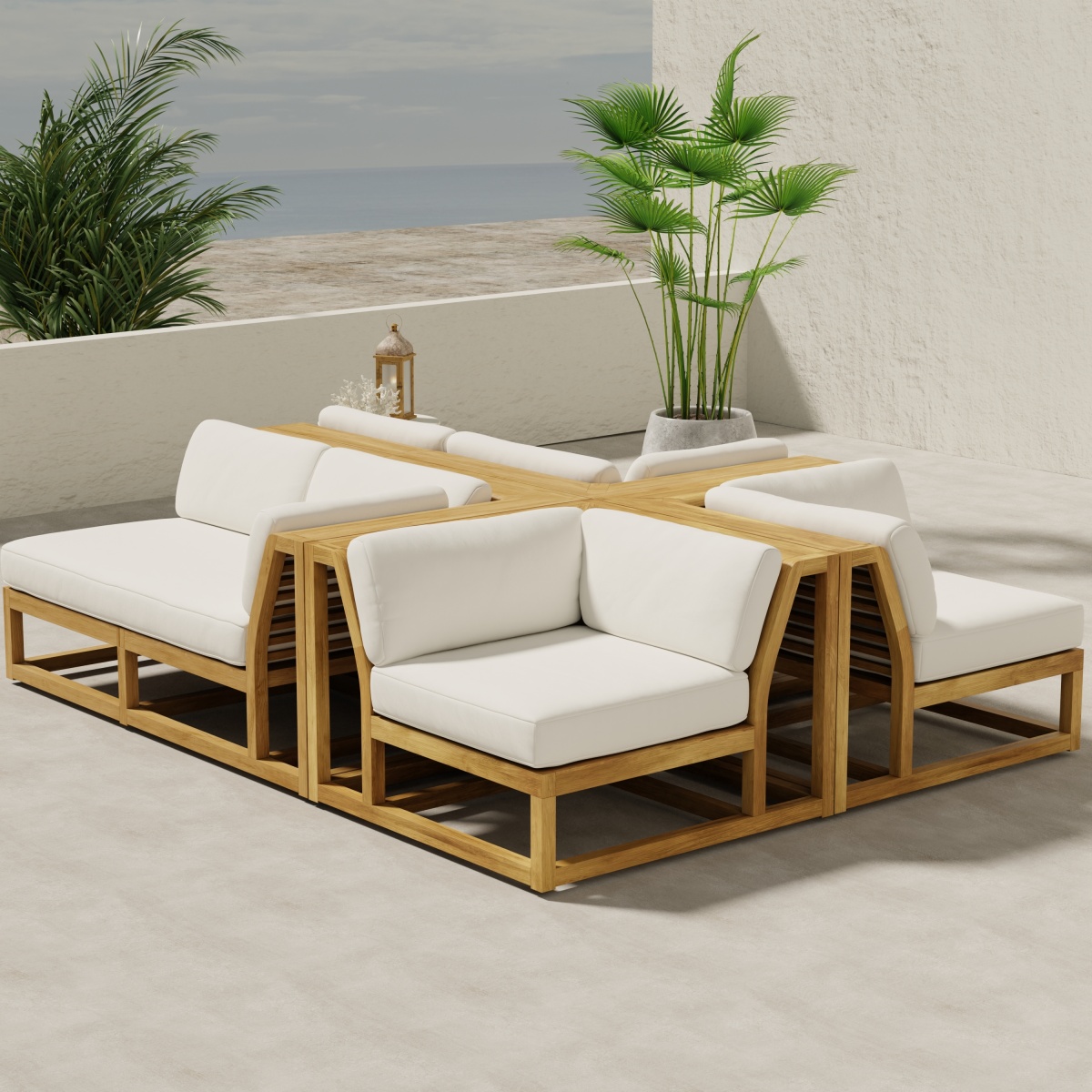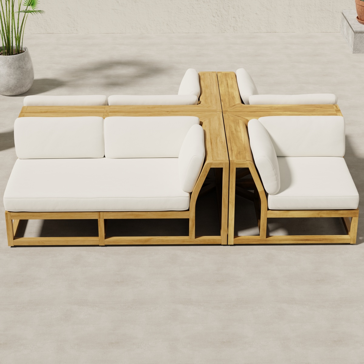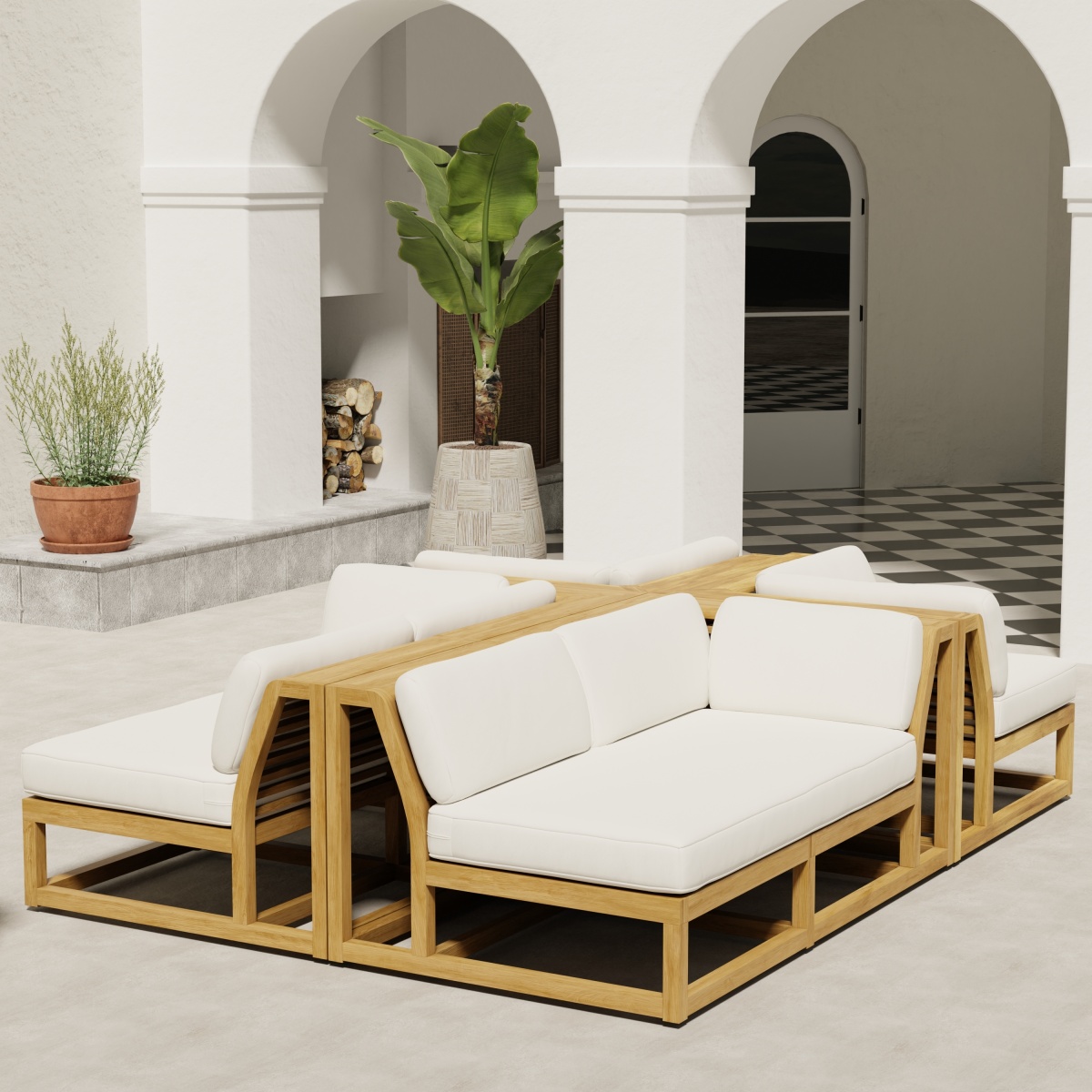 Plush, deep cushions atop clean-lined solid teak frames give the impression of visual lightness while the Maya 6" wrap around armrests allow ample space for drinks, yet are sturdy enough to sit on. This set creates a dynamic lounge sofa, perfect for waiting rooms and lobbies. Alternatively, the set can be arranged into two separate sofas that face each other to promote friendly conversation. Versatile and functional, this set can be paired with other pieces from the Maya collection to create a wide range of configurations depending on your needs and imagination.