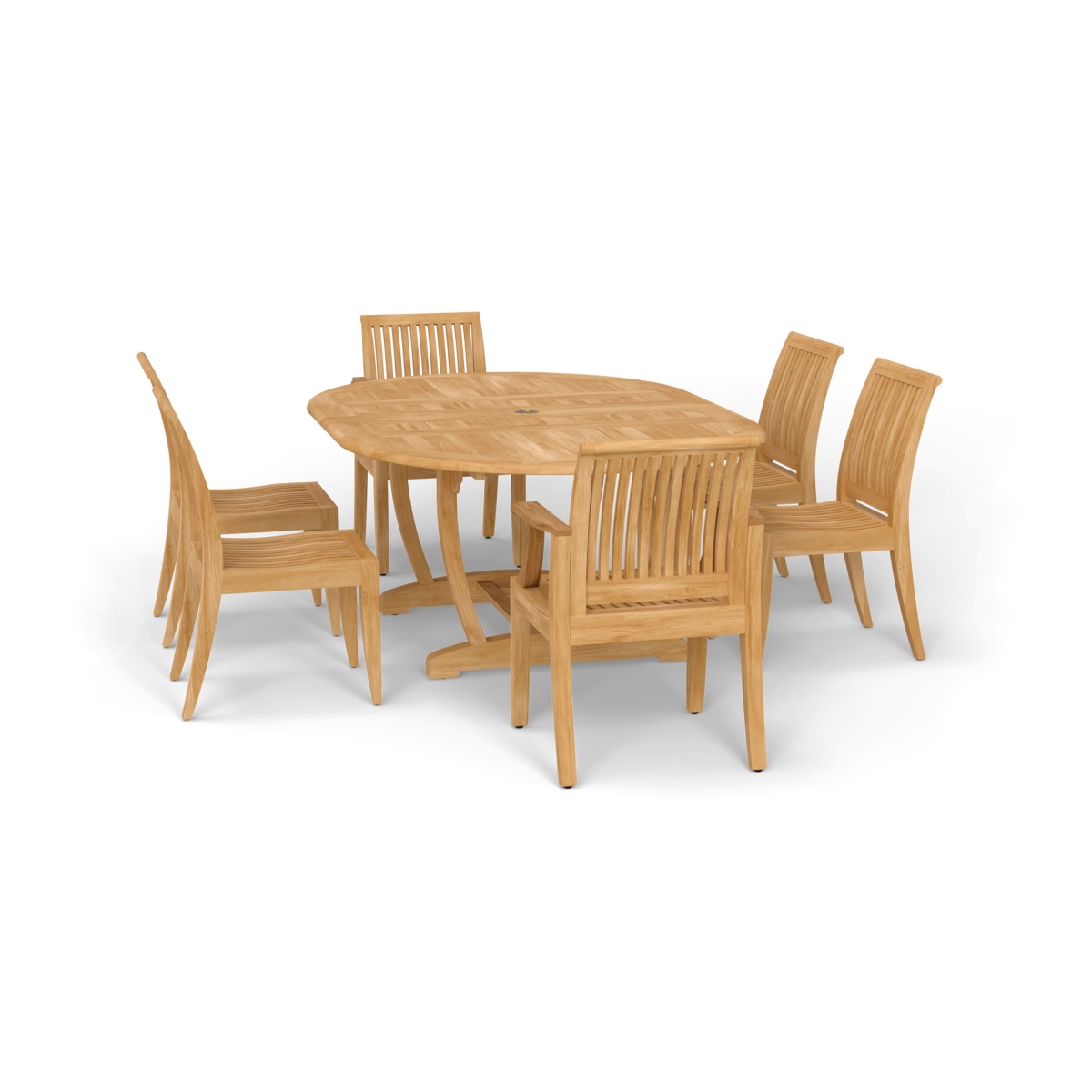 The Martinique Teak Table has a sense of refinement with an understanding of functional requirements with its bowed legs and oval design. Featuring dual butterfly extension leaves integrated into the table, the Montserrat can seat 4-8 as needed, and can fit our teak umbrella in both positions. While the table is durable for years in the outdoors, it is just as suitable for the indoors. The Martinique Extension Table accommodates all standard height Westminster Teak Dining Chairs.