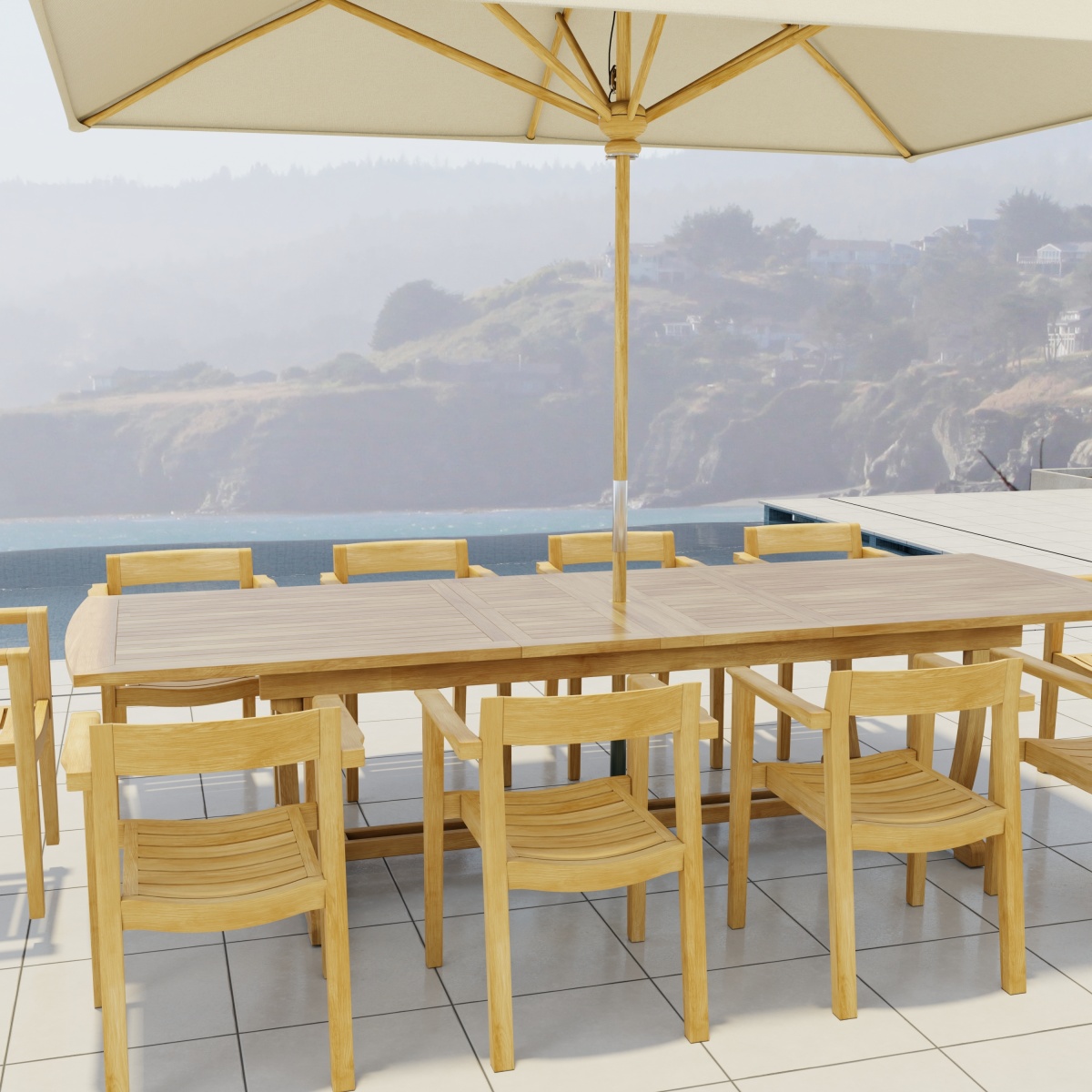 The Grand Horizon 11 pc Dining Set combines traditional teak craftsmanship with hints of Danish modern design and clean lines. The contoured backrests and seats of the Horizon dining chairs maximize comfort even without cushions, while the Grand Veranda Table extends to allow seating for 6-12 guests.
