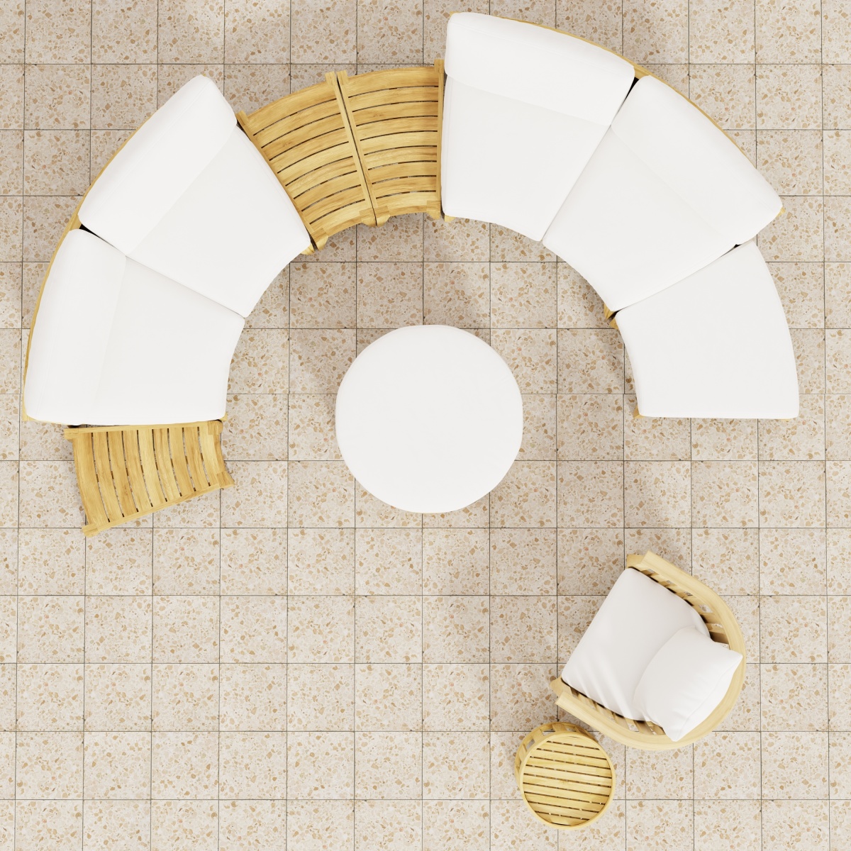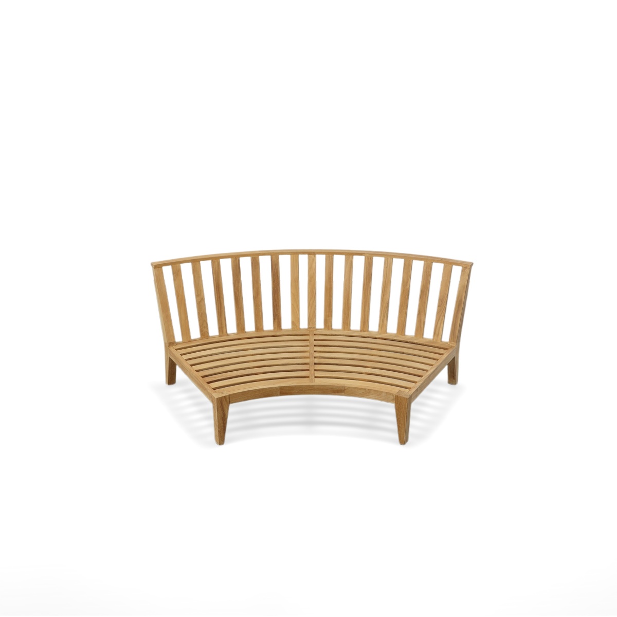 The curve of the Kafelonia Sectional Benches allow them to be arranged in many ways as a unique focal point for any garden niche or placed around a coffee table as a conversational centre piece. Plush, deep cushions atop a clean-lined solid teak curved frame give the visual impression of lightness, perfect for any family gatherings. Part of the Kafelonia Collection.