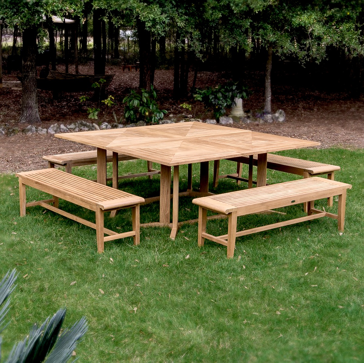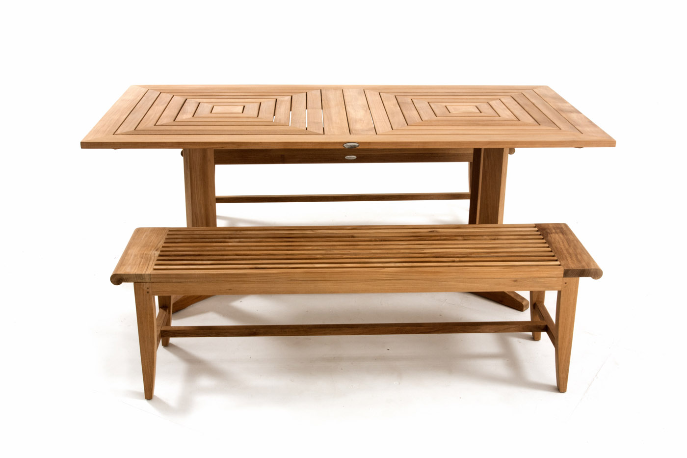 6 ft Pyramid Teak Table: Glides 5 ft Laguna Teak Backless Bench: Medium Levelers |