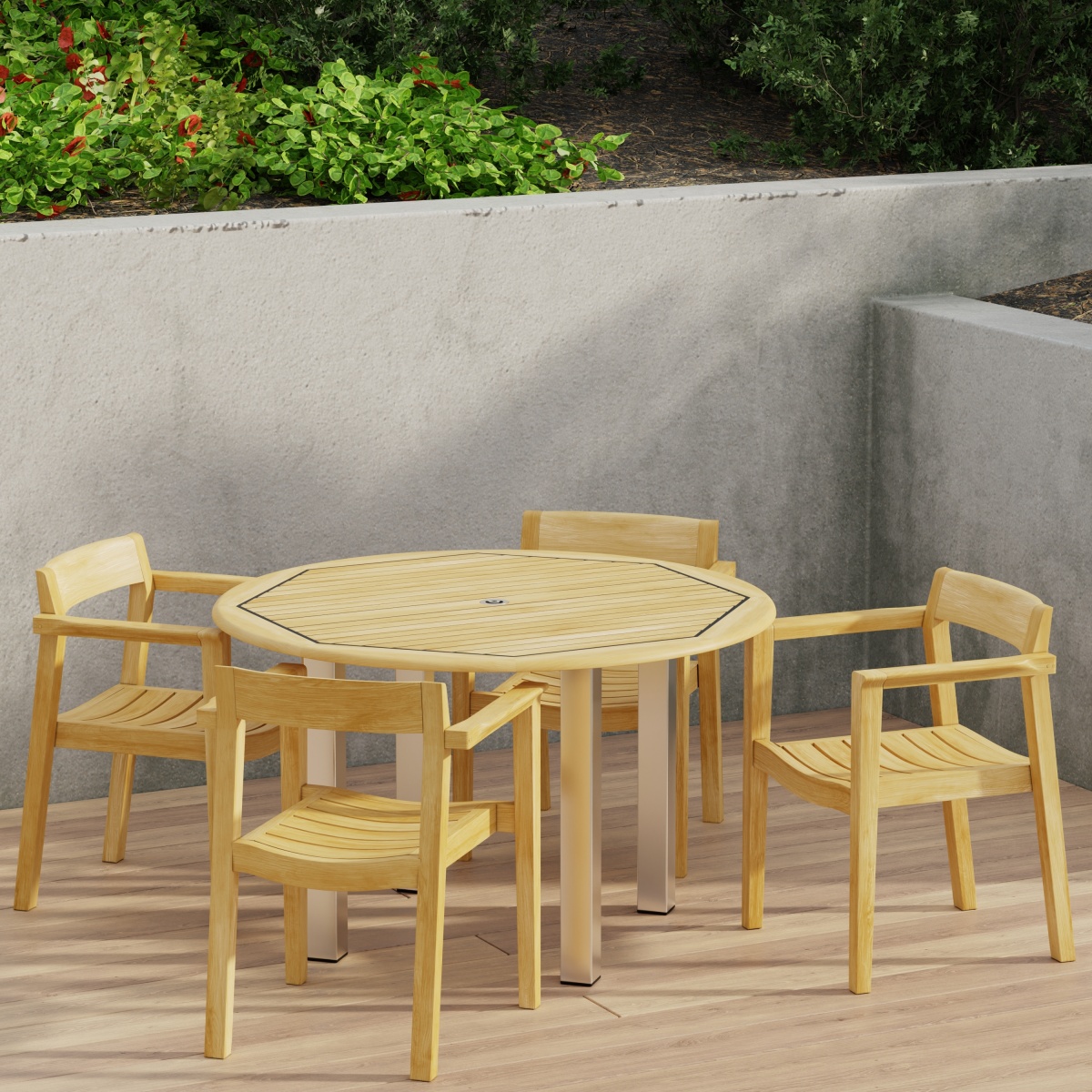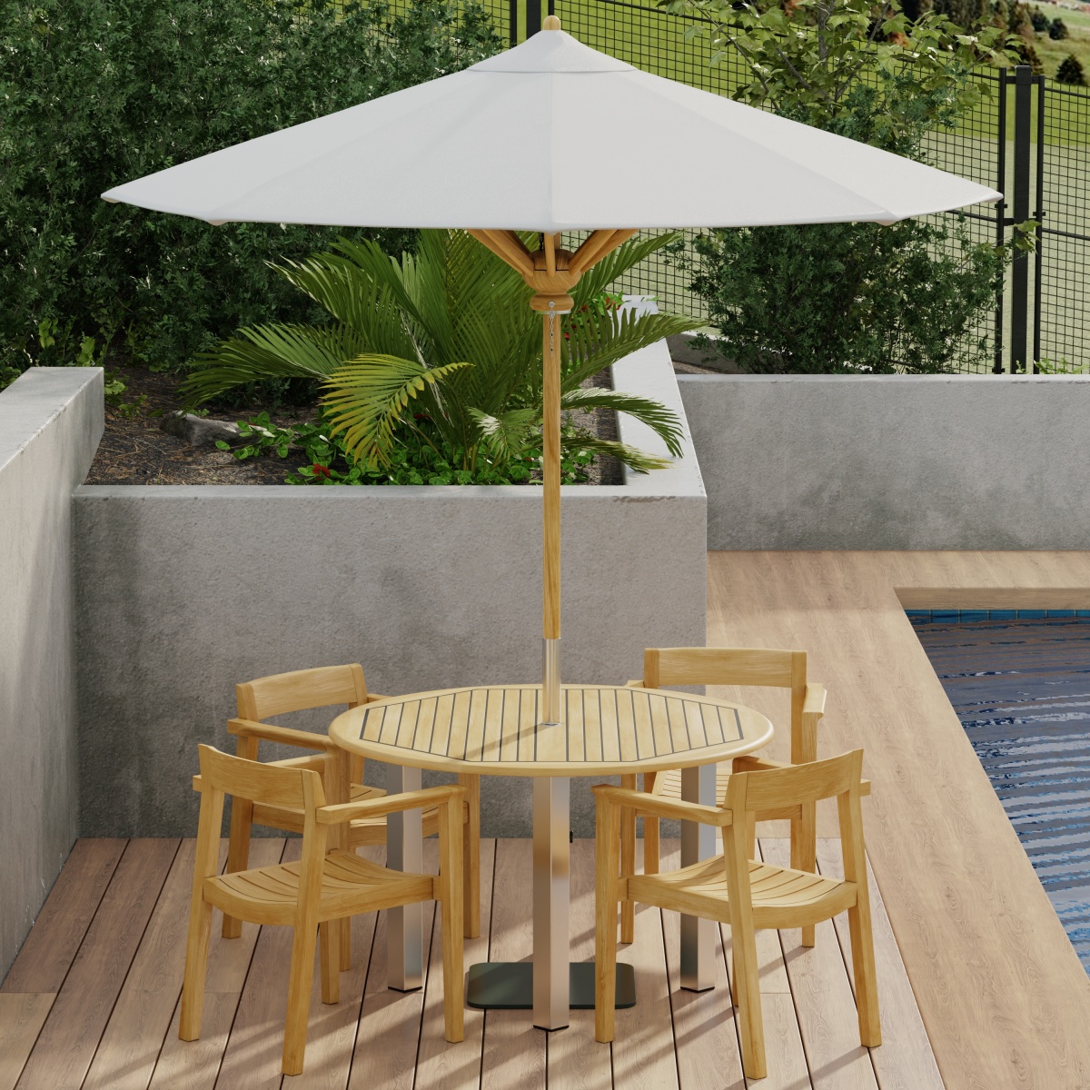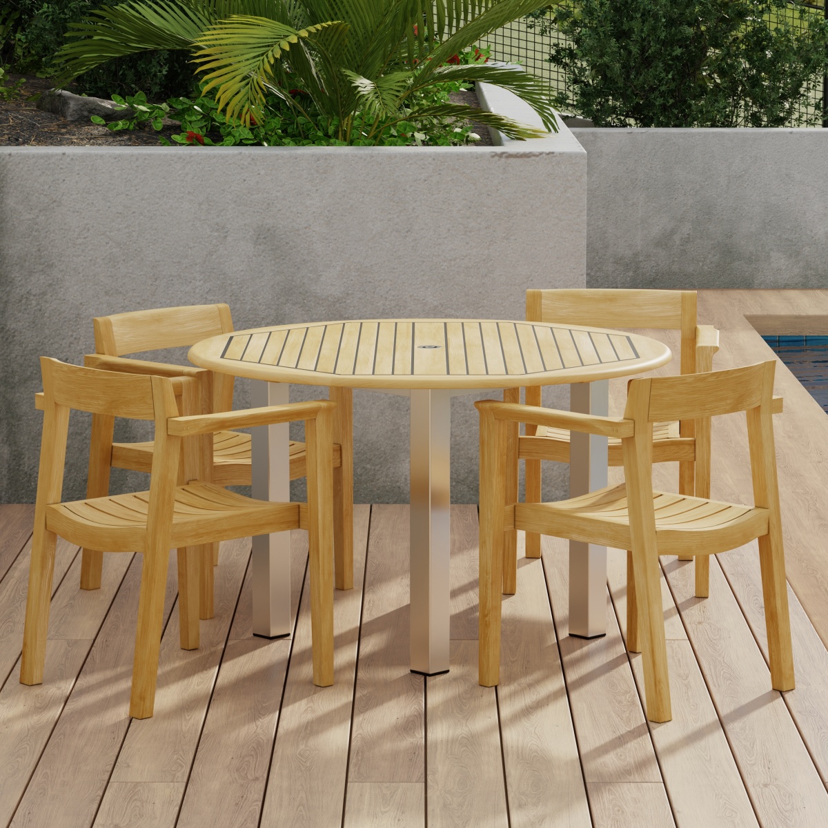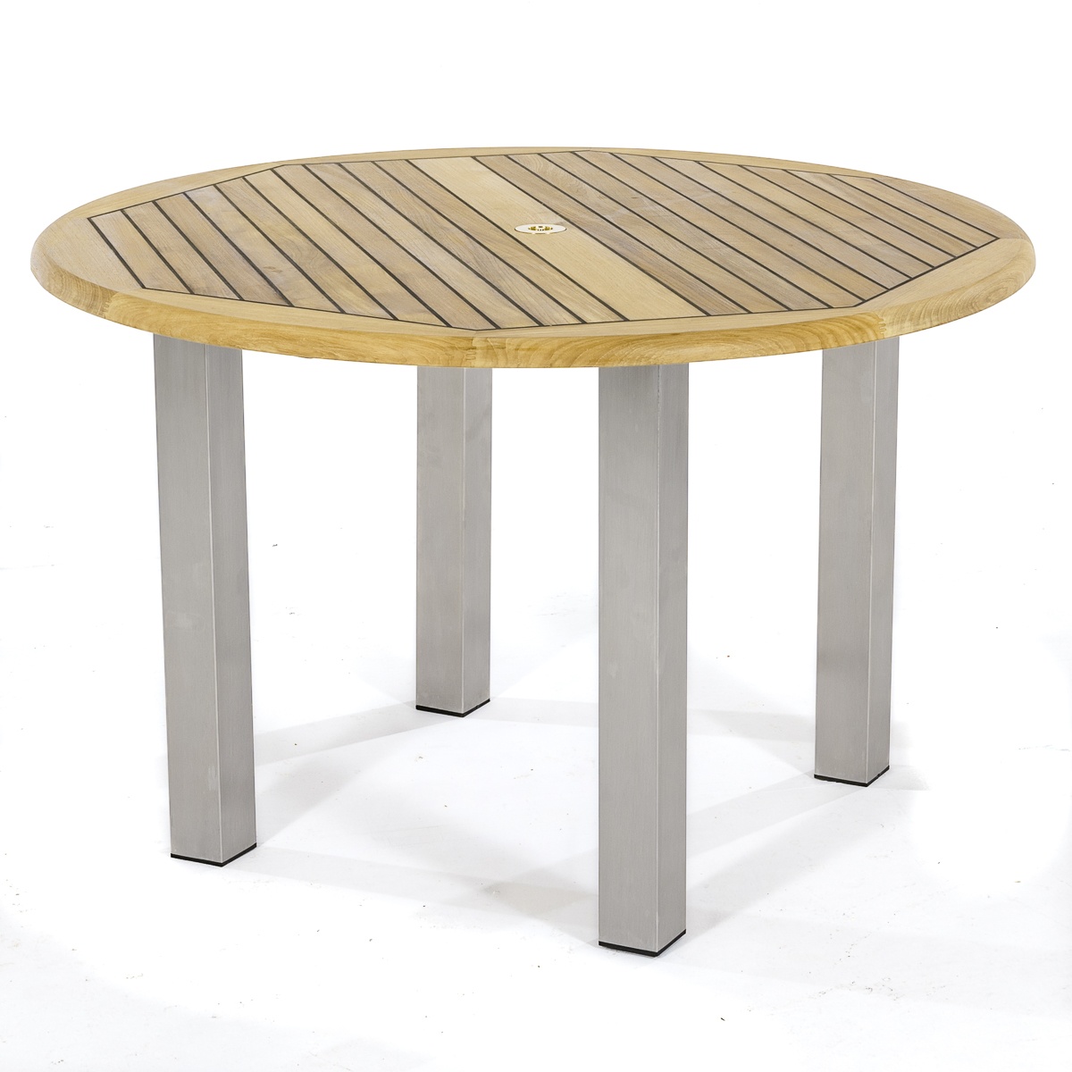 With the interplay of teak and stainless steel in the Vogue Table and the Horizon Chairs' clean lines, the Vogue Horizon Round Dining Set for 4 exemplifies traditional craftsmanship meeting modern design. The Vogue Table's use of stainless steel and Sikaflex (a high-grade polyurethane sealant in the tabletop slats) provides a nautical appeal, unexpectedly complementing the hints of Danish modern design of the chairs. Crafted with the use of two classic outdoor materials, this set will endure the test of time and the outdoors.