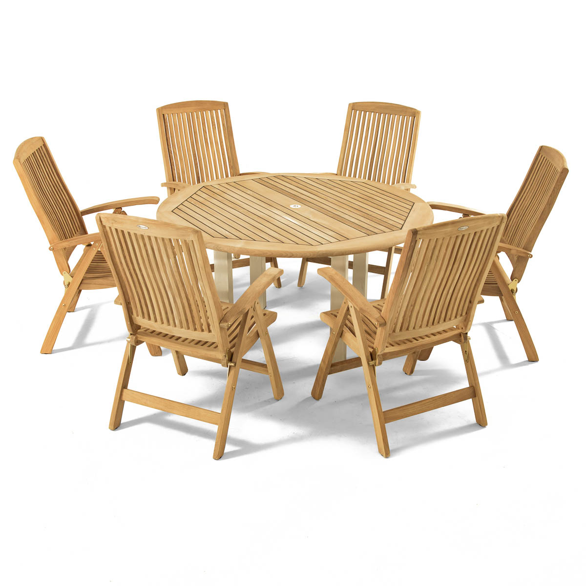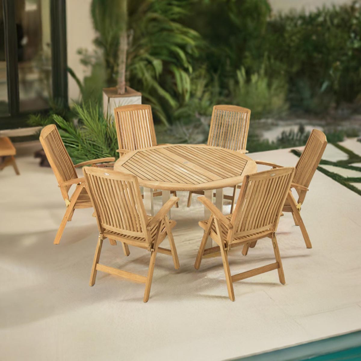 Pairing contemporary design with classic comfort, the Vogue Reclining Set for 6 is inviting and convenient. The Barbuda Recliners offer generous proportions and 6 reclining positions, while the interplay of teak and stainless steel in the Vogue table expresses a refined sense of style.