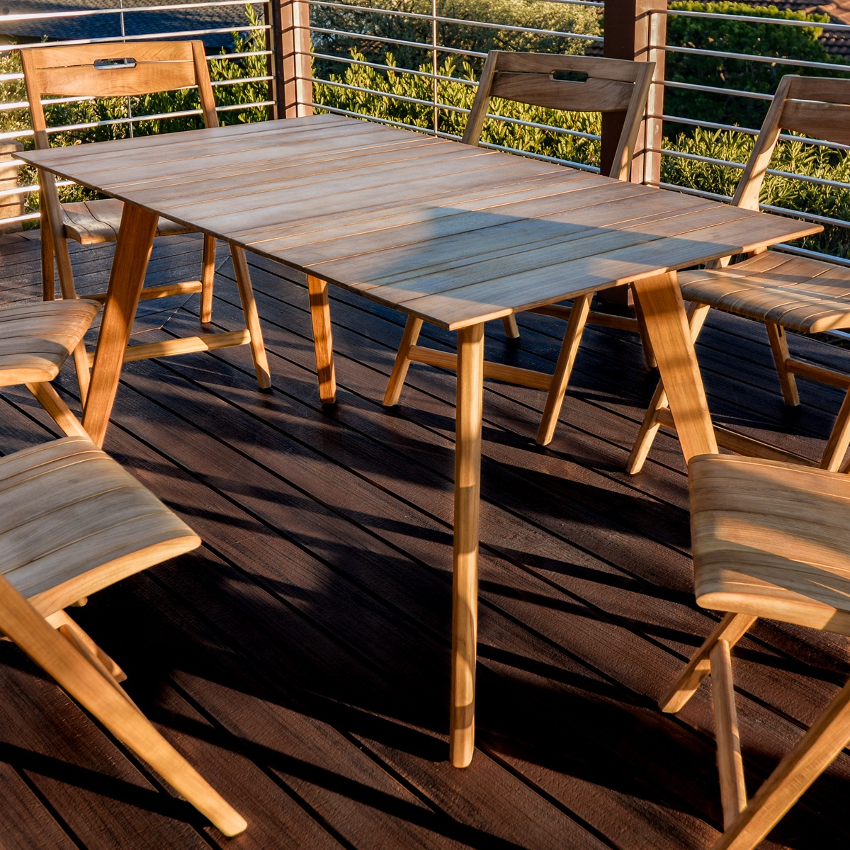 With clean lines and welcoming curves, the 5 piece Surf Dining Set is immediately appealing. First impressions hardly reveal that the exceptionally comfortable Surf Chairs fold effortlessly. Generously scaled and visually robust, the Surf Chairs are relatively lightweight yet structurally strong given their solid teak stature. The Surf Table draws inspiration from Scandinavian architecture, lending it a light and airy appearance. Its irresistibly smooth tabletop makes it an excellent choice for the indoors, though it is more than robust to endure the test of time and the outdoors. Part of the Surf Collection.
