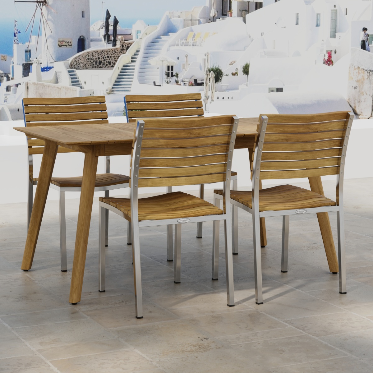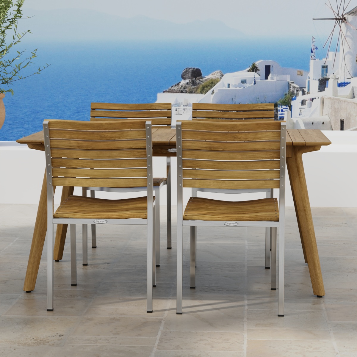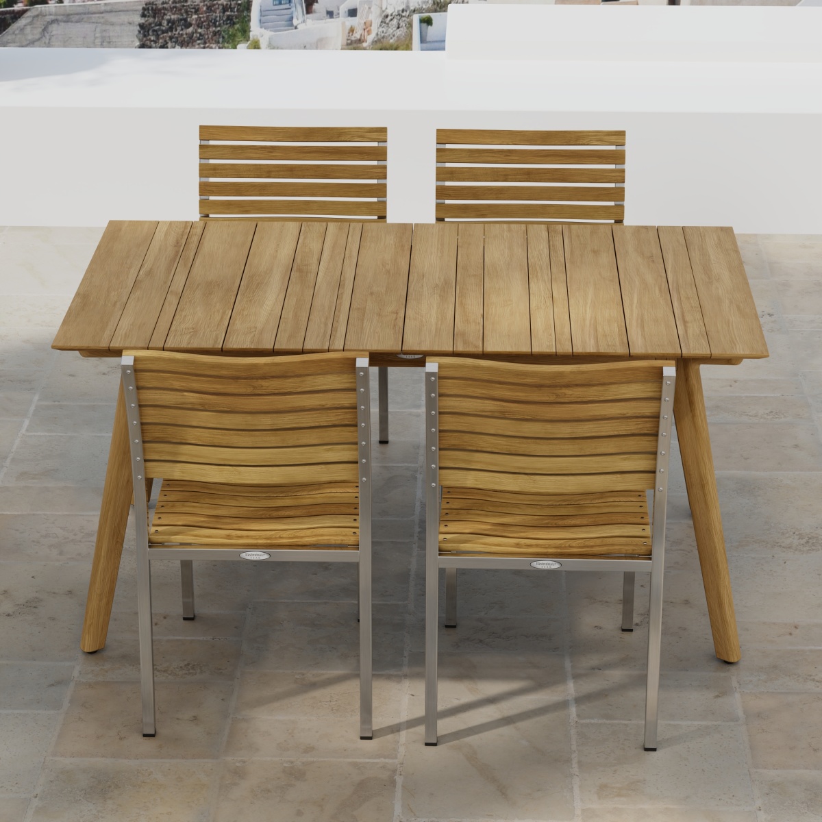 First impressions hardly reveal that the exceptionally comfortable Vogue Chairs Stack effortlessly. Generously scaled and visually robust, the chairs are relatively lightweight yet structurally strong given their solid teak and Stainless Steel stature. The Surf Rectangular Table draws inspiration from Scandinavian architecture, lending it a light and airy appearance. Its irresistibly smooth tabletop makes it an excellent choice for the indoors, though it is more than robust to endure the test of time and the outdoors.