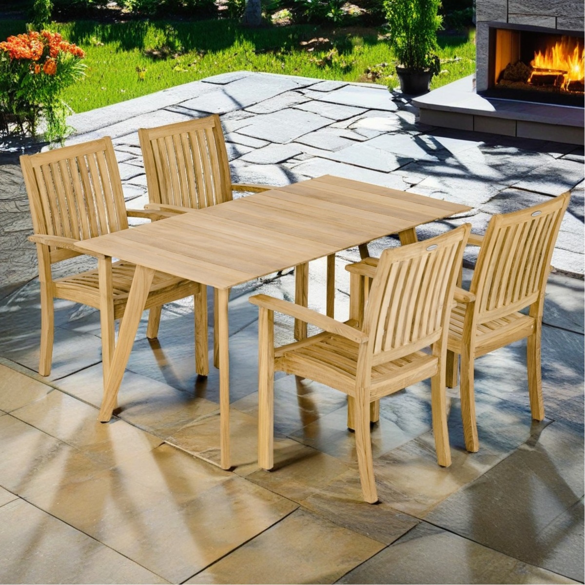 The Sussex Stacking Teak Patio Set comes complete with our Surf Rectangular Patio Table and four of our beautiful Sussex Stacking Patio Chairs. The chairs stack for easy and convenient storage when not in use. Made of SVLK certified teak wood that is able to withstand the rigors of adverse climates, however, because of Westminster Teak's well known micro-smooth finish and quality craftsmanship, many use our furniture indoors as well.