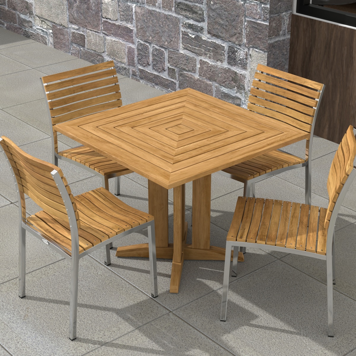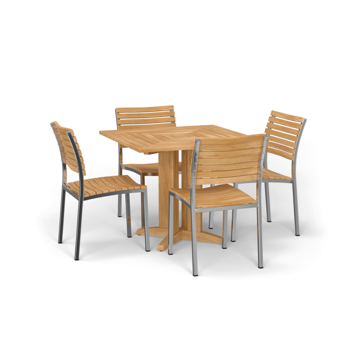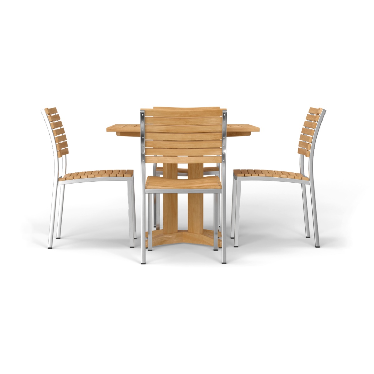 With the interplay of 304 Stainless Steel and Teak Wood, the Vogue Pyramid Dining Set defines contemporary dining. The gently curved backrests and scooped seats of the Vogue Chairs offer unrestricted movement and lasting comfort even without cushions. The Pyramid Table Collection draws its beauty from its geometric lines. The tabletop’s reducing square design coupled with classic forms in its leg bases gives the collection its name.