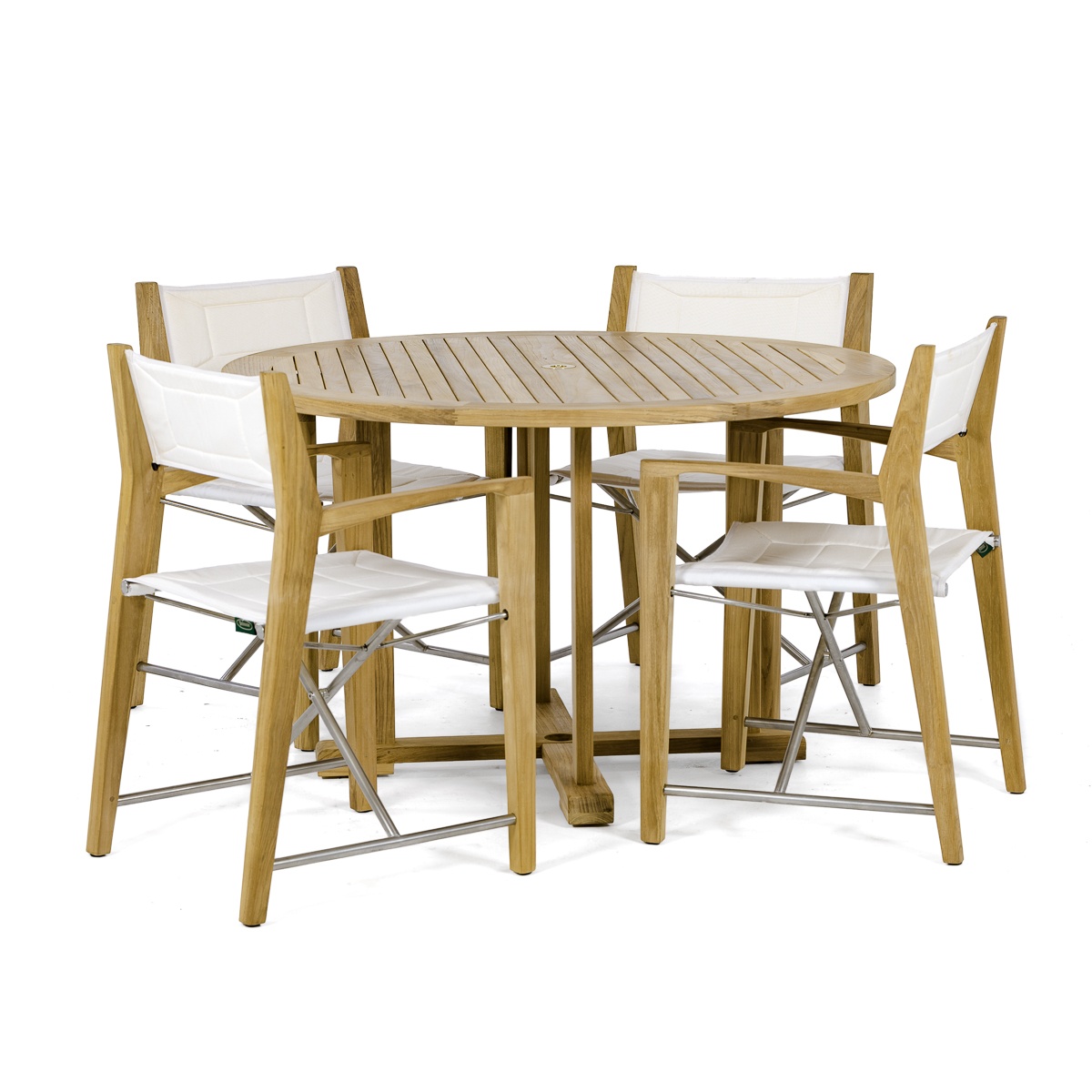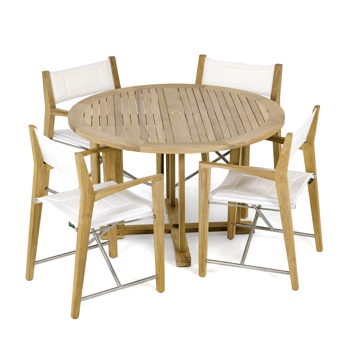 With both traditional and modern appeals, the 5 piece Round Odyssey Dining Set is defined by convenience and versatility. Though lightweight, the Odyssey Folding Dining Chair is visually robust and structurally strong given its solid stature. Whether used as a dining table on an outdoor patio, in the garden, or at a luxury resort, the 4 ft Round Teak Table will define any space and complement any style. For outdoor use, it is designed with a hole for our teak umbrella.