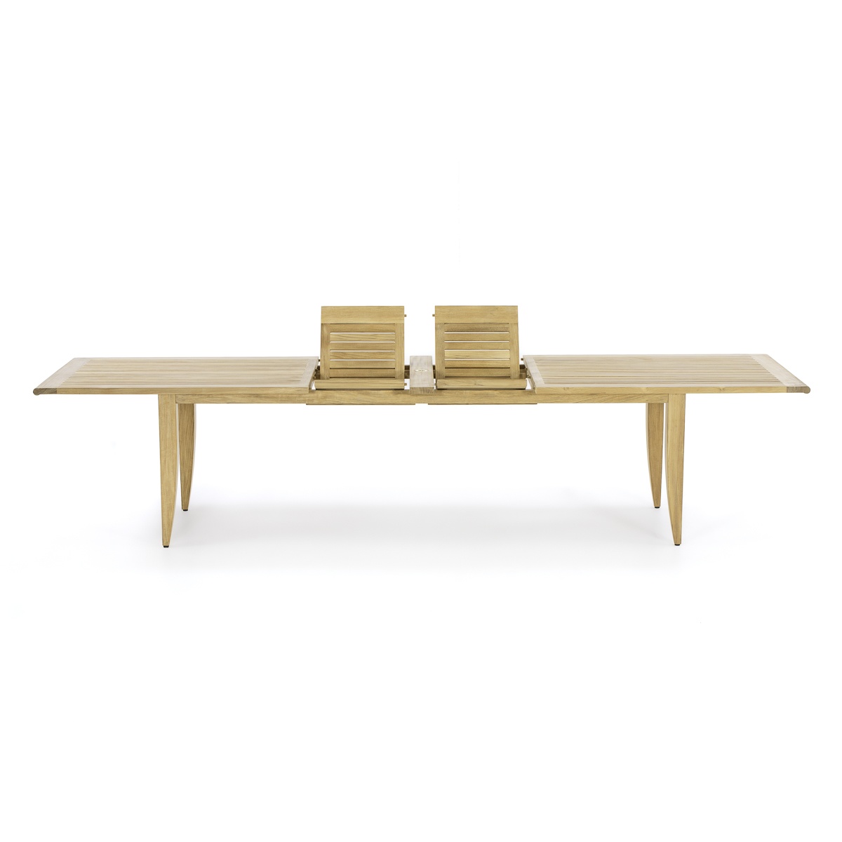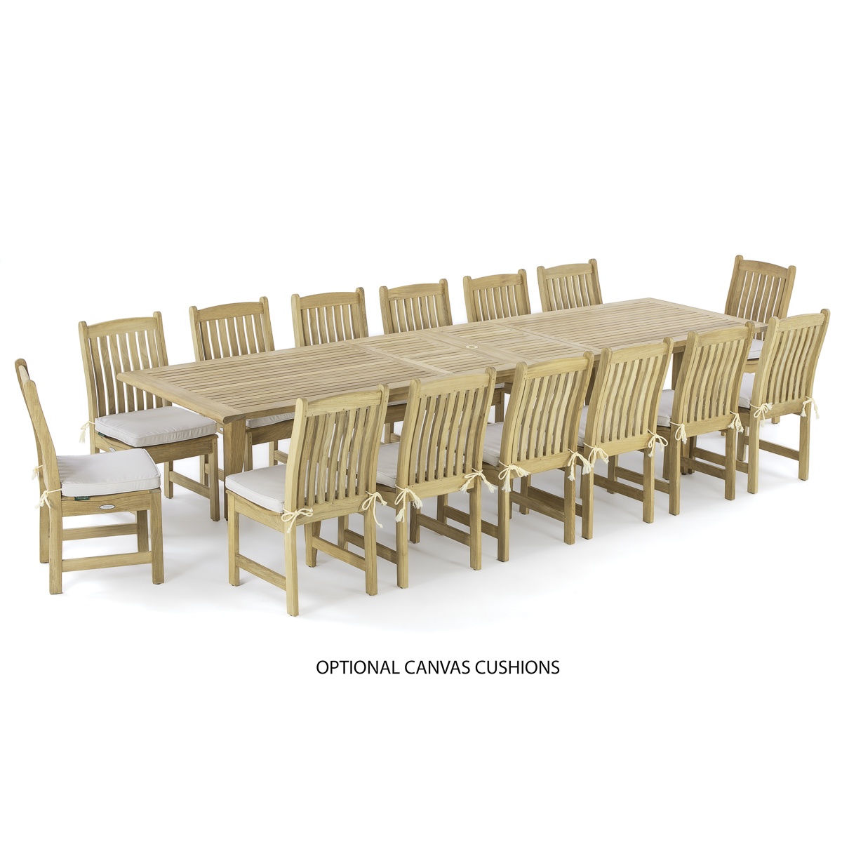 The elegant and classic 15 Piece Grand Laguna Veranda Dining Set is designed as a 14 person dining table that could easily convert to 8 or 10 with timeless quality in mind. Including our largest outdoor table, the Grand Laguna, and Veranda dining chairs, this set will become the center of any family gathering from holiday meals or dinner parties. An optional umbrella, Sunbrella Cushions, Teak Floor Tiles and Lazy Susan are available for this set.