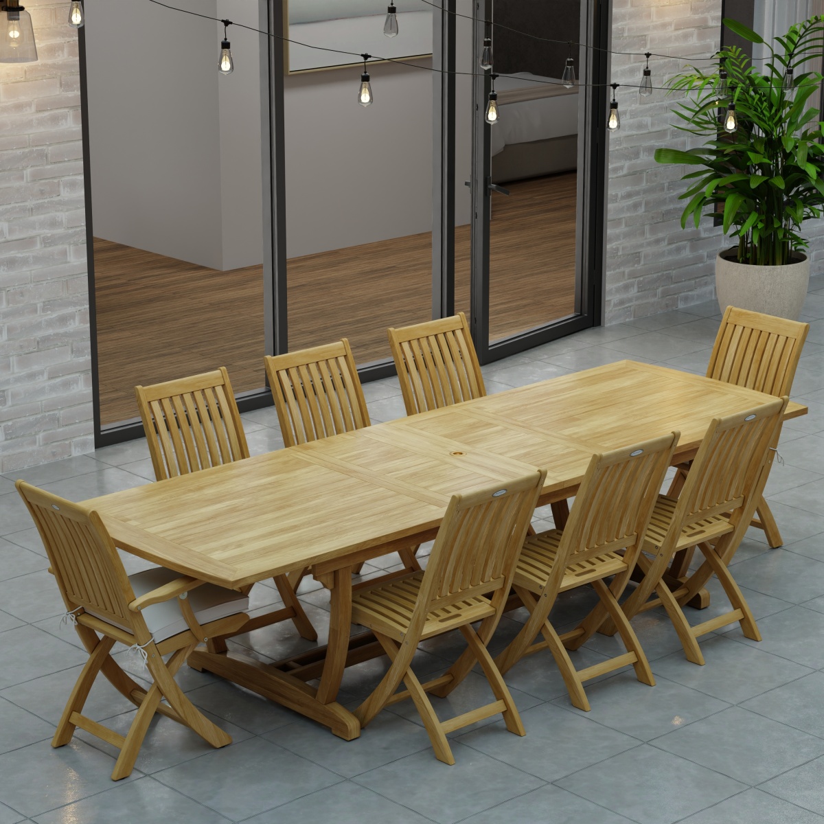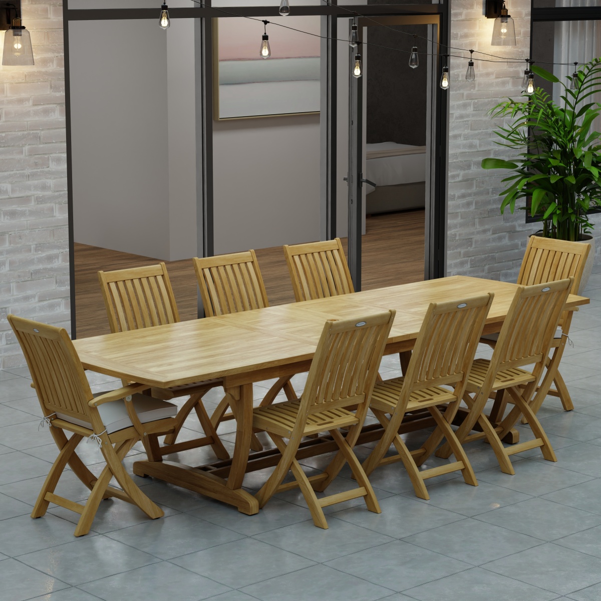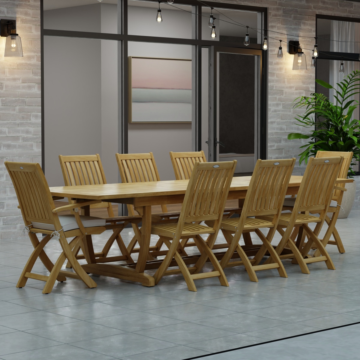 Veranda Teak Table: Large Levelers Barbuda Teak Armchair: Glides Barbuda Teak Folding Chair: Glides |