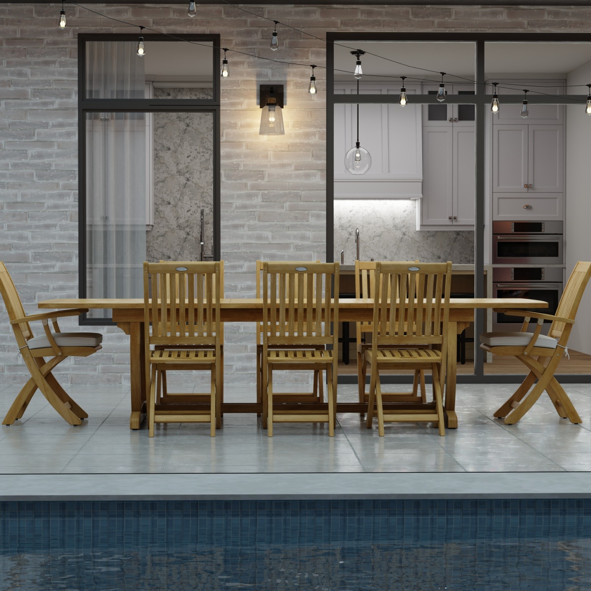 The Veranda Barbuda Dining Set for 8 unites traditional design with modern versatility. The Grand Veranda Table extends to seat up to 12 and the chairs fold for easy storage.