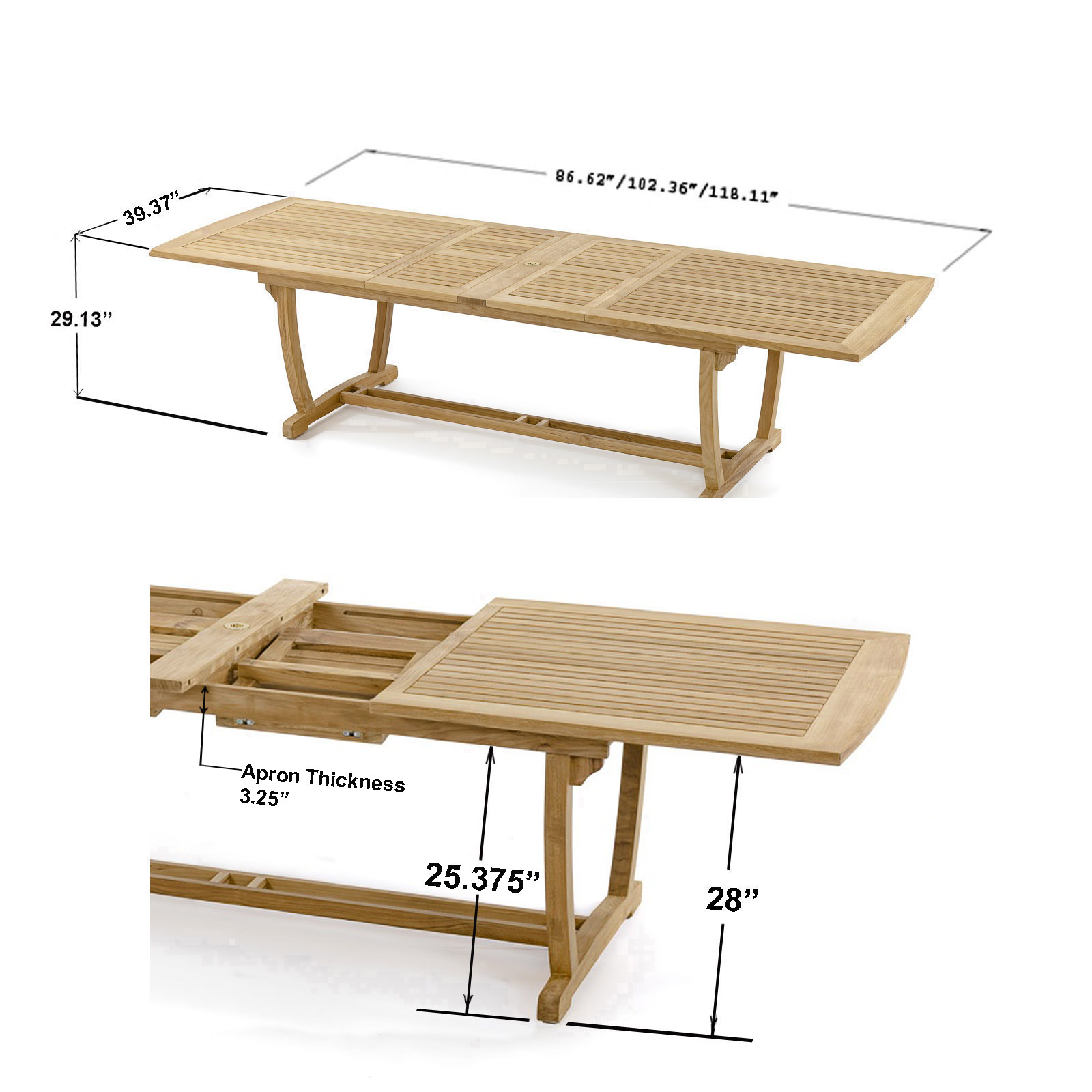 Table - 86.25/102/118" L x 39.25" W x 29.25" H Side Chairs - 25.5" L x 16.75" W x 38.75" H Armchairs - 26" L x 21.85" W x 38.5" H |