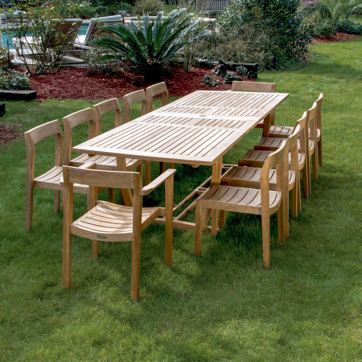 The Grand Horizon 13 pc Dining Set combines traditional teak craftsmanship with hints of Danish modern design and clean lines. The contoured backrests and seats of the Horizon dining chairs maximize comfort even without cushions, while the Grand Veranda Table extends to allow seating for 6-12 guests.