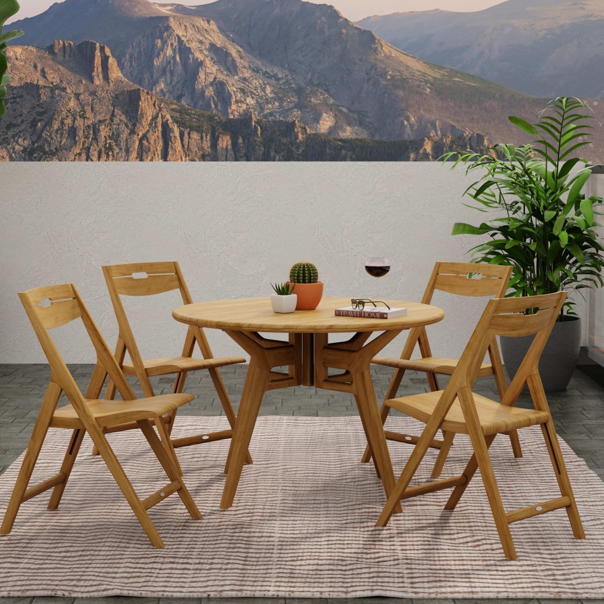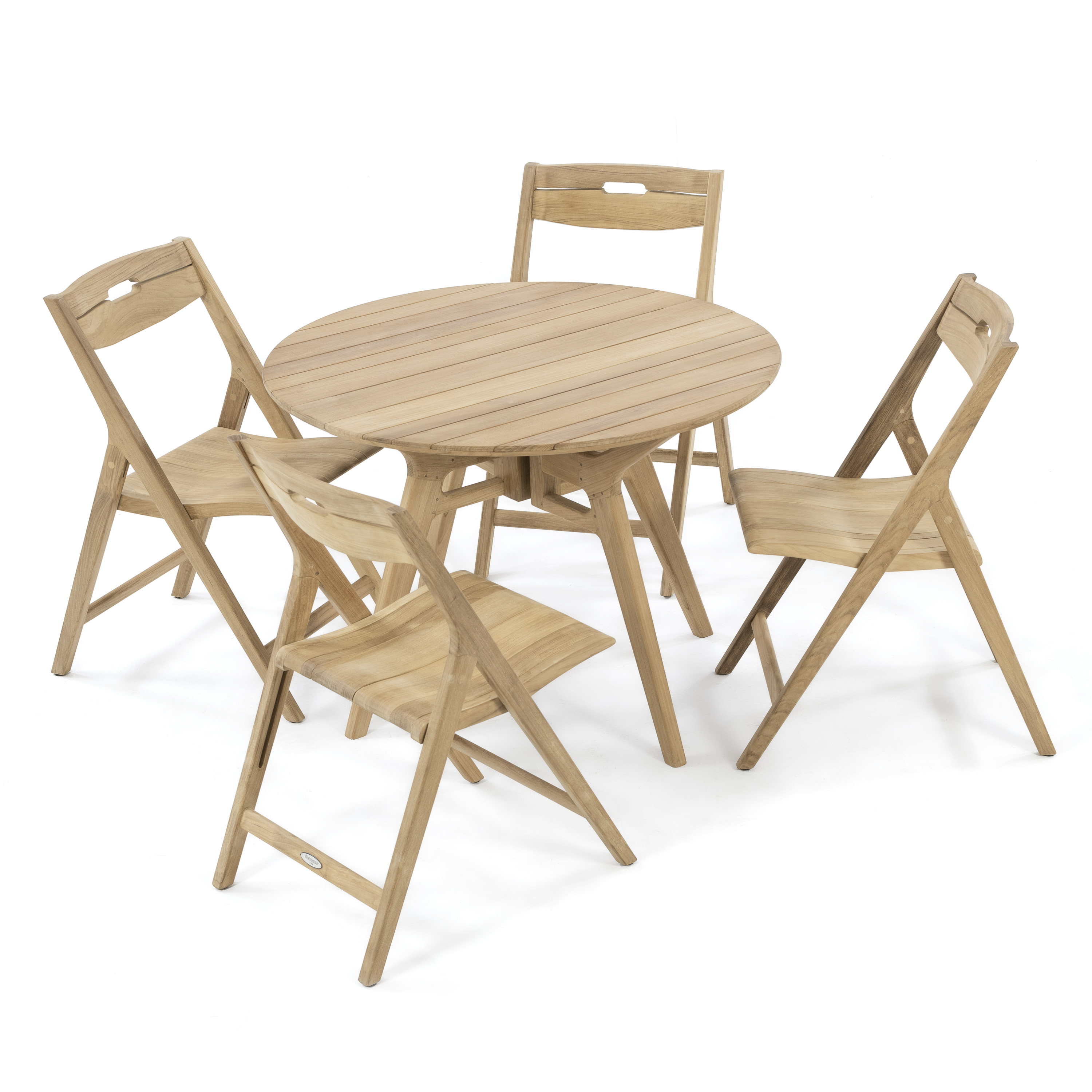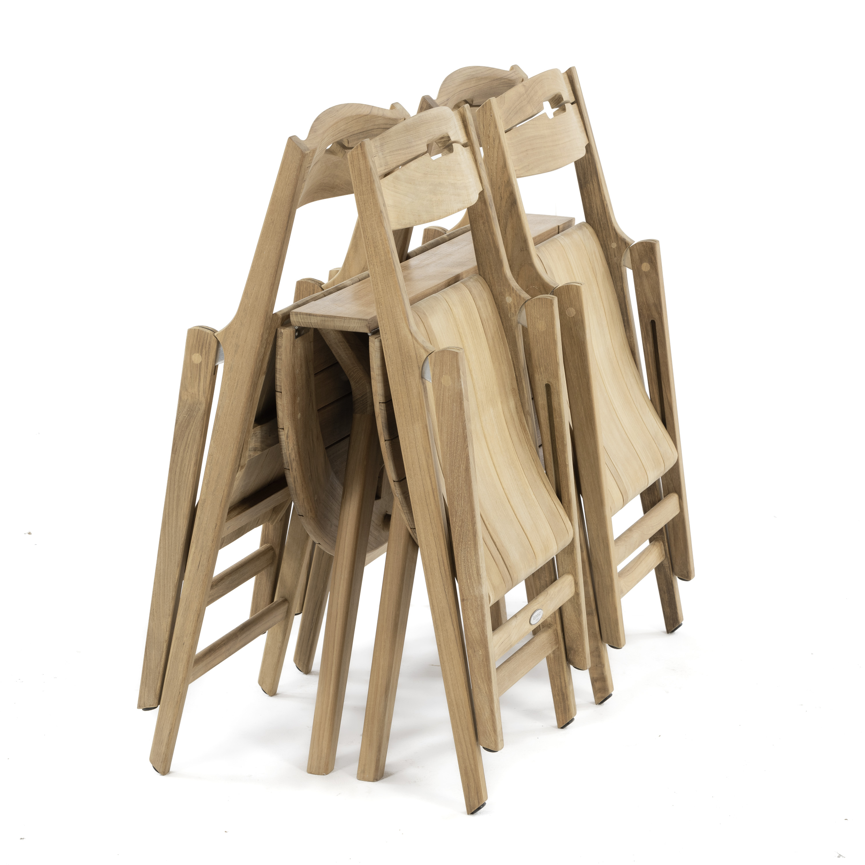 With clean lines and welcoming curves, the Surf Round 5 piece Dining Set is immediately appealing. First impressions hardly reveal that the exceptionally comfortable Surf chairs fold effortlessly. Generously scaled and visually robust, the chairs are relatively lightweight yet structurally strong given their solid teak stature. The Surf Round Table draws inspiration from Scandinavian architecture, lending it a light and airy appearance. Its irresistibly smooth tabletop makes it an excellent choice for the indoors, though it is more than robust to endure the test of time and the outdoors. Part of the Surf Collection.