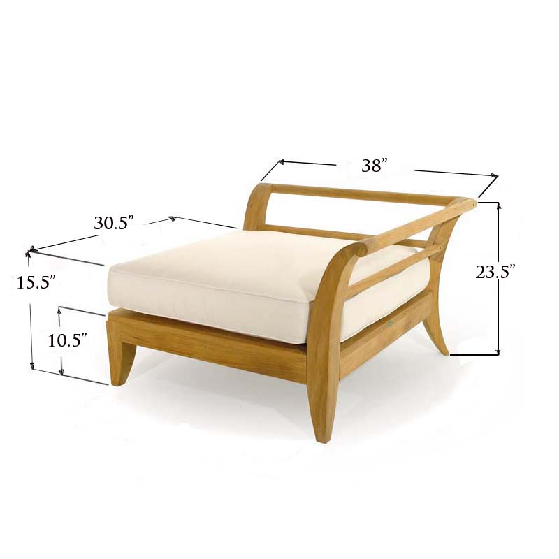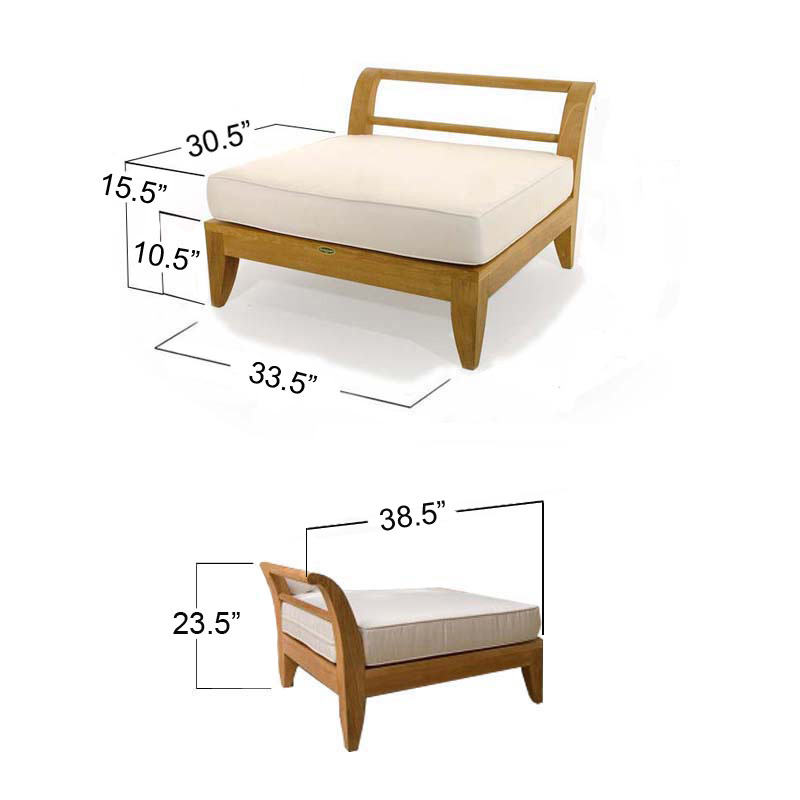72” L x 72” W 10.5” Teak seat to ground 15.5” Ground to top of cushion Corner Sectional - 38.5” L x 38.5” W Backrest 23.5” Ground to Backrest Top 10.5”H Floor to Seat 15.5”H Floor to seat cushion top 30.5”Sq. Seating Area End Sectional - 38.5” Backrest to Front Seat Length 23.5” Ground to backrest top 33.5” Seating Width x 30.5” Seat Depth 10.5” Floor to Seat 15.5” Floor to Seat Cushion Top Coffee Table - 33.5” L x 33.5” W x 10.5” H Table Top Thickness - 1” End Table - 33.5” L x 17.6” W x 10.5” H |