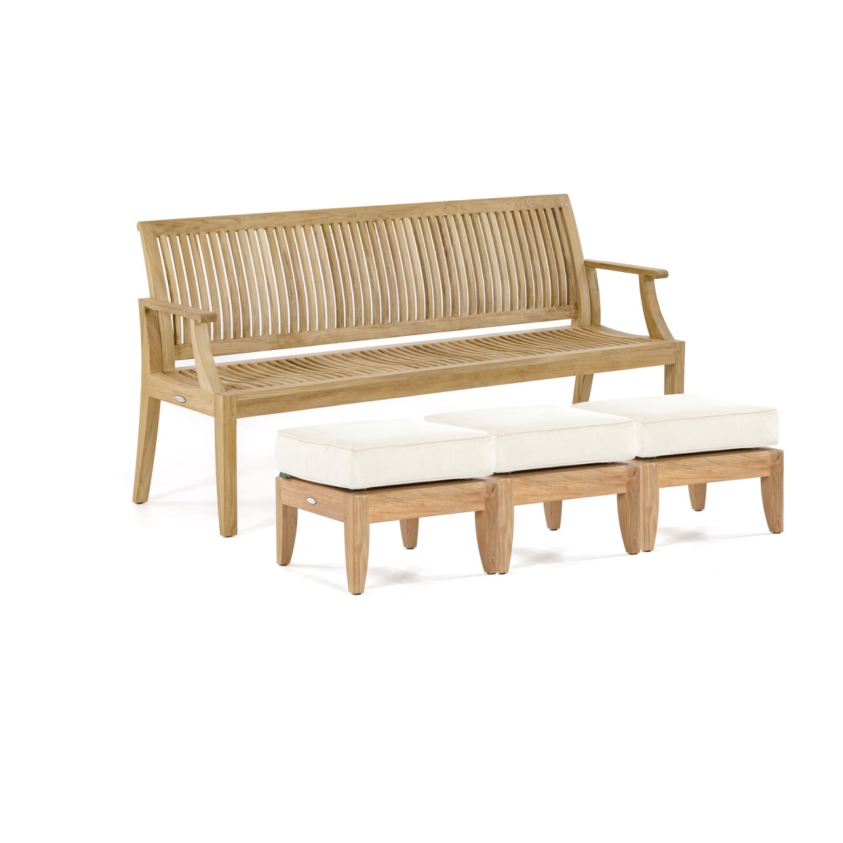 The Laguna Teak Bench and Ottoman Set for 2 makes a bold yet simple statement in any environment, from the loggia to the living room. The transitional design of the Laguna Collection mixes a solid classic functionality with a modern clean aesthetic. Generously proportioned, this set ensures hours of comfort, whether indoors or out.
