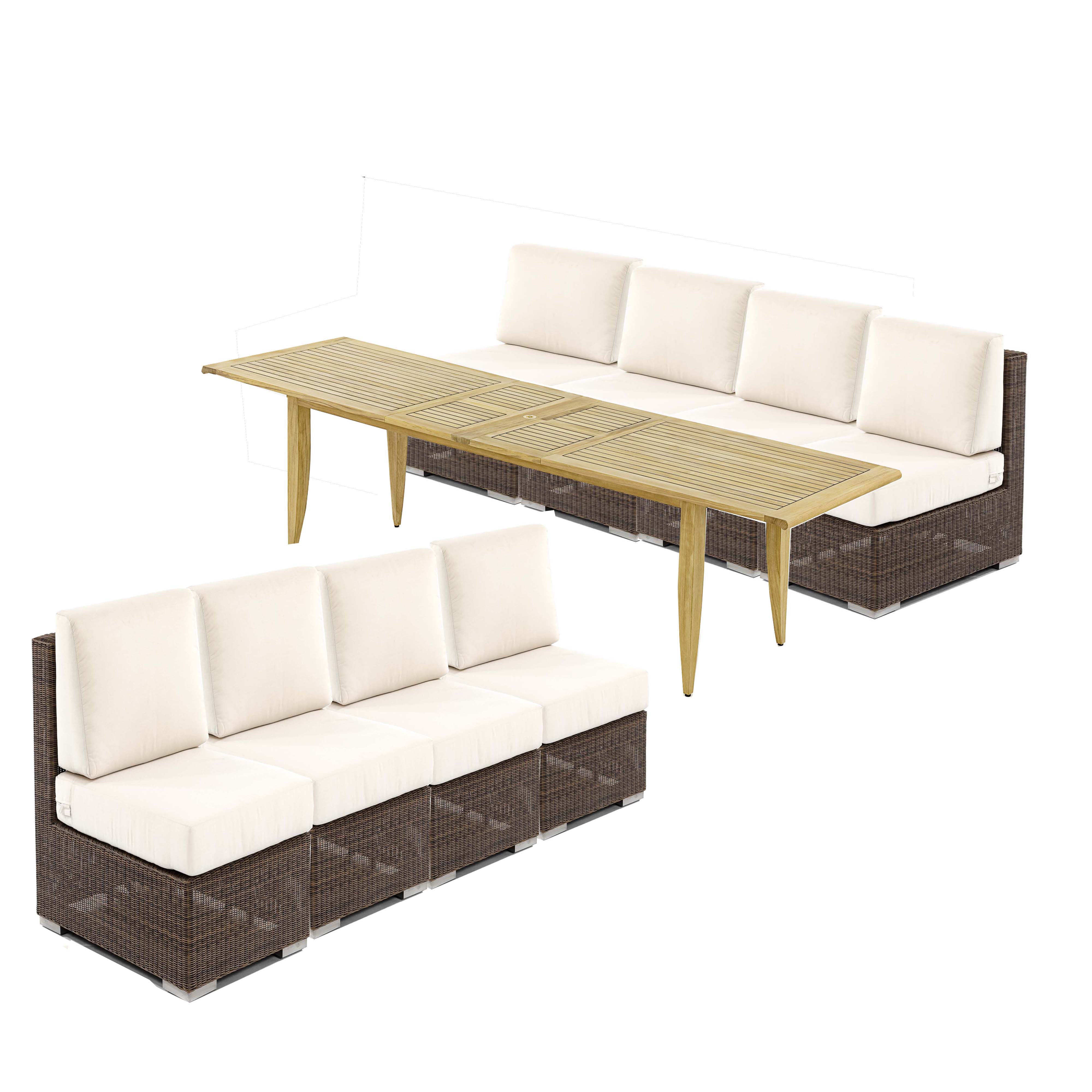 Plush, deep cushions atop clean-lined Woven Wicker frames give the impression of visual lightness of the Malaga Slipper Chair accents the entire Malaga Collection by providing additional seating to this already luxurious group. Plush deep seating cushions sit atop a minimal, but extremely sturdy Wicker Woven frame, giving an impression of visual lightness. The set includes a beautifully crafted dining table which is extendable from 101.5” to 133” (> 11ft). Designed to accommodate up to 14, the 36” narrower table width allows for more congenial gatherings in mind, with family and friends, in large or smaller settings. This set creates a perfect size for cozy dining with someone special.